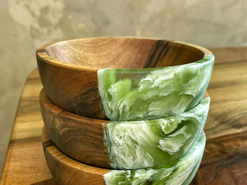Ez a tál a műhelyemben készül tömör fa és műgyanta kombinációjával, amely minden darabnak egyedi megjelenést ad, a természet által inspirálva. Minden darab egyedi – nincs két teljesen azonos.