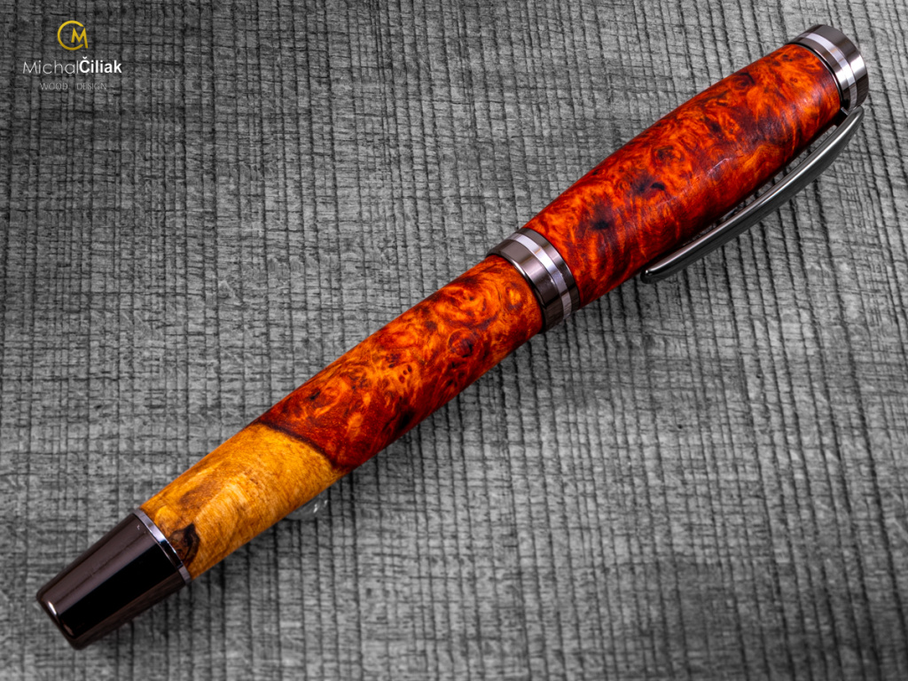 Ručně vyrobené pero z Ambonea Burl wood – luxusní dřevo s jedinečnou kresbou Toto pero je opravdu jedinečné. Ručně jsem ho vyrobil z Ambonea Burl wood, jednoho z nejvzácnějších a nejluxusnějších druhů dřeva na světě, známého svou výraznou kresbou a kontrastními odstíny od zlaté po tmavě červenou. Každý kus je originál – nikdy nenajdete dvě pera se stejnou strukturou dřeva. Ambonea wood pochází z Indonésie, nejčastěji z ostrovů Borneo, Sulawesi a Moluky. Dřevo je tvrdé, odolné a díky pomalému růstu stromů má nádhernou bohatou texturu, která na peru vytváří efektní trojrozměrný vzhled. Proces výroby je náročný – dřevo je pečlivě opracováno a spojeno do finálního tvaru. Každé pero je ručně soustruženo, leštěno a ošetřeno přírodními vosky a oleji. Výsledkem je elegantní, pevné a luxusní pero, které skvěle sedí v ruce a dlouhodobě odolává opotřebení. TIP! Pero z Ambonea Burl wood je perfektní luxusní dárek, který kombinuje jedinečný design a vzácné dřevo. Ideální pro sběratele, milovníky psacích potřeb, nebo jako originální dárek k narozeninám, výročí či významným událostem. Každý kus má svůj jedinečný příběh díky své kresbě a charakteru dřeva. S tímto perem můžete psát své vlastní příběhy nebo ho darovat někomu, kdo ocení skutečný luxus a jedinečnost.