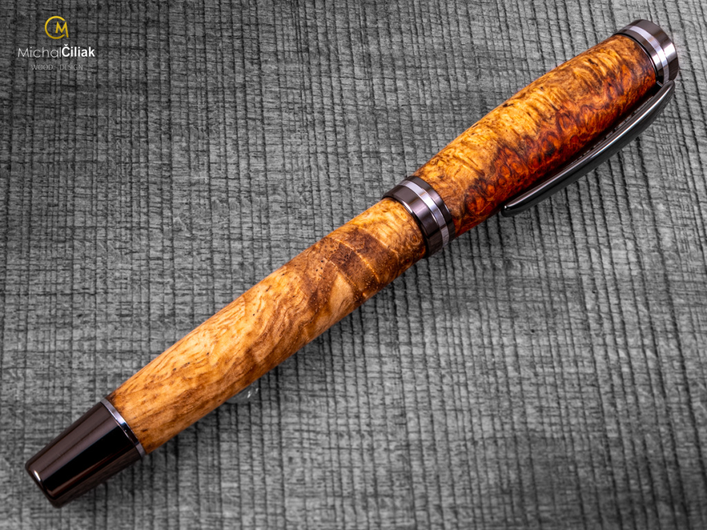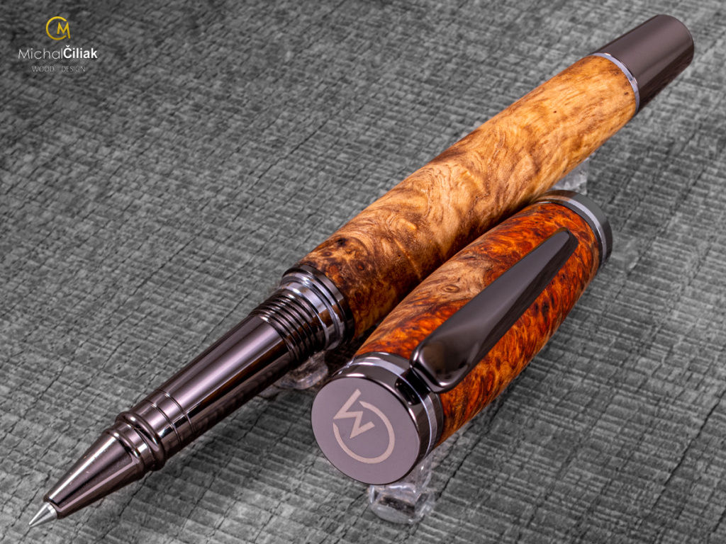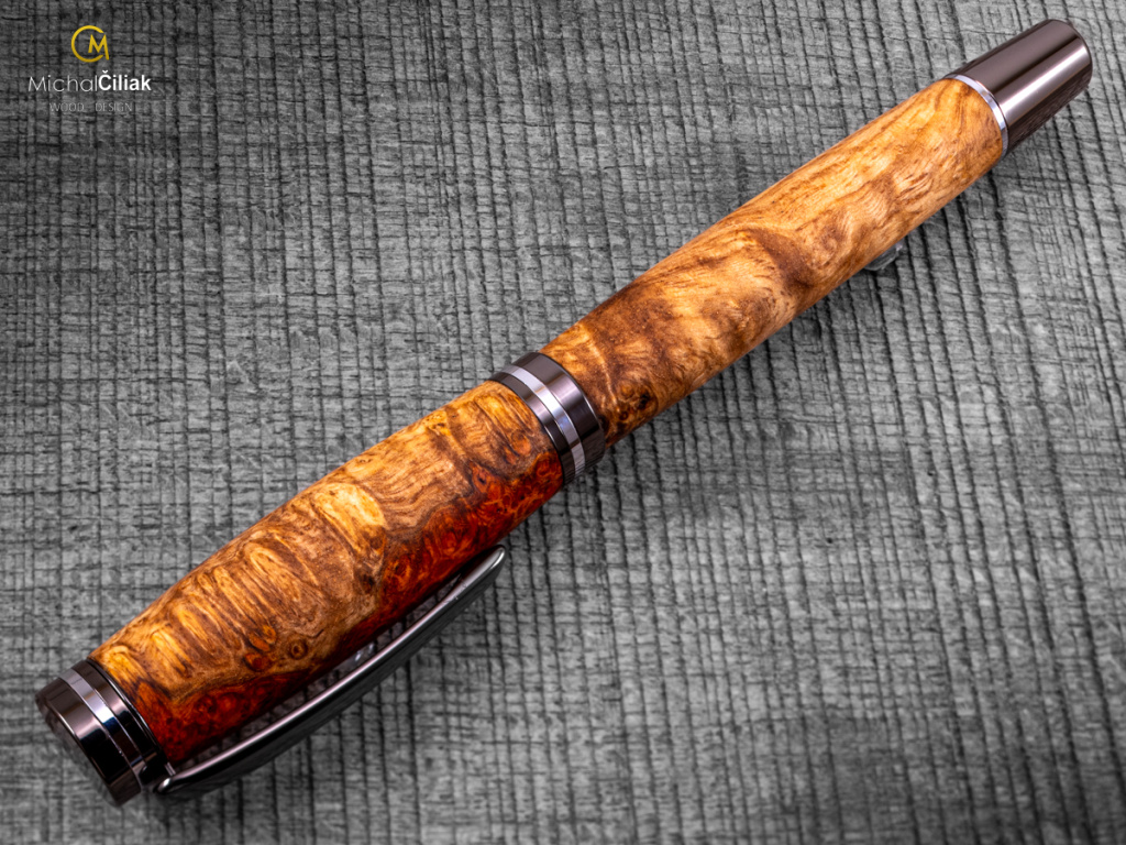 Ručně vyrobené pero z Ambonea Burl wood – luxusní dřevo s jedinečnou kresbou Toto pero je opravdu jedinečné. Ručně jsem ho vyrobil z Ambonea Burl wood, jednoho z nejvzácnějších a nejluxusnějších druhů dřeva na světě, známého svou výraznou kresbou a kontrastními odstíny od zlaté po tmavě červenou. Každý kus je originál – nikdy nenajdete dvě pera se stejnou strukturou dřeva. Ambonea wood pochází z Indonésie, nejčastěji z ostrovů Borneo, Sulawesi a Moluky. Dřevo je tvrdé, odolné a díky pomalému růstu stromů má nádhernou bohatou texturu, která na peru vytváří efektní trojrozměrný vzhled. Proces výroby je náročný – dřevo je pečlivě opracováno a spojeno do finálního tvaru. Každé pero je ručně soustruženo, leštěno a ošetřeno přírodními vosky a oleji. Výsledkem je elegantní, pevné a luxusní pero, které skvěle sedí v ruce a dlouhodobě odolává opotřebení. TIP! Pero z Ambonea Burl wood je perfektní luxusní dárek, který kombinuje jedinečný design a vzácné dřevo. Ideální pro sběratele, milovníky psacích potřeb, nebo jako originální dárek k narozeninám, výročí či významným událostem. Každý kus má svůj jedinečný příběh díky své kresbě a charakteru dřeva. S tímto perem můžete psát své vlastní příběhy nebo ho darovat někomu, kdo ocení skutečný luxus a jedinečnost.