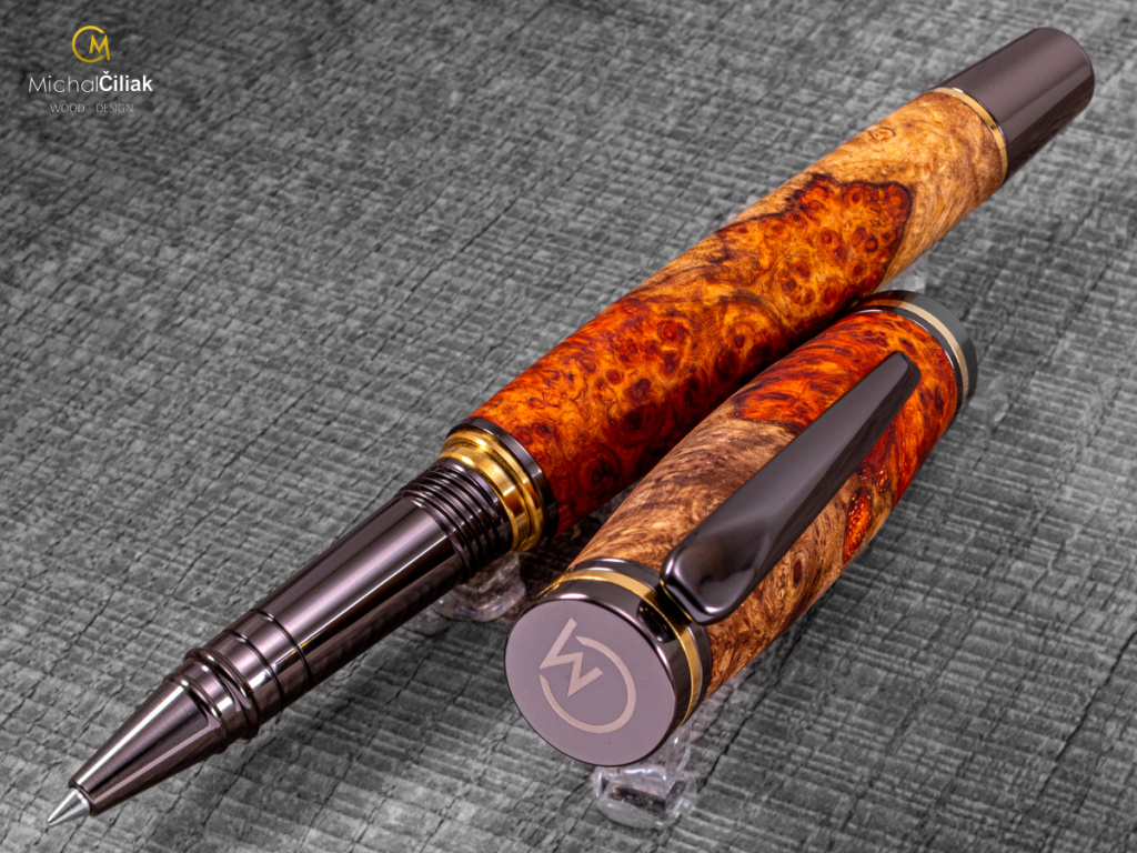 Ručně vyrobené pero z Ambonea Burl wood – luxusní dřevo s jedinečnou kresbou Toto pero je opravdu jedinečné. Ručně jsem ho vyrobil z Ambonea Burl wood, jednoho z nejvzácnějších a nejluxusnějších druhů dřeva na světě, známého svou výraznou kresbou a kontrastními odstíny od zlaté po tmavě červenou. Každý kus je originál – nikdy nenajdete dvě pera se stejnou strukturou dřeva. Ambonea wood pochází z Indonésie, nejčastěji z ostrovů Borneo, Sulawesi a Moluky. Dřevo je tvrdé, odolné a díky pomalému růstu stromů má nádhernou bohatou texturu, která na peru vytváří efektní trojrozměrný vzhled. Proces výroby je náročný – dřevo je pečlivě opracováno a spojeno do finálního tvaru. Každé pero je ručně soustruženo, leštěno a ošetřeno přírodními vosky a oleji. Výsledkem je elegantní, pevné a luxusní pero, které skvěle sedí v ruce a dlouhodobě odolává opotřebení. TIP! Pero z Ambonea Burl wood je perfektní luxusní dárek, který kombinuje jedinečný design a vzácné dřevo. Ideální pro sběratele, milovníky psacích potřeb, nebo jako originální dárek k narozeninám, výročí či významným událostem. Každý kus má svůj jedinečný příběh díky své kresbě a charakteru dřeva. S tímto perem můžete psát své vlastní příběhy nebo ho darovat někomu, kdo ocení skutečný luxus a jedinečnost.