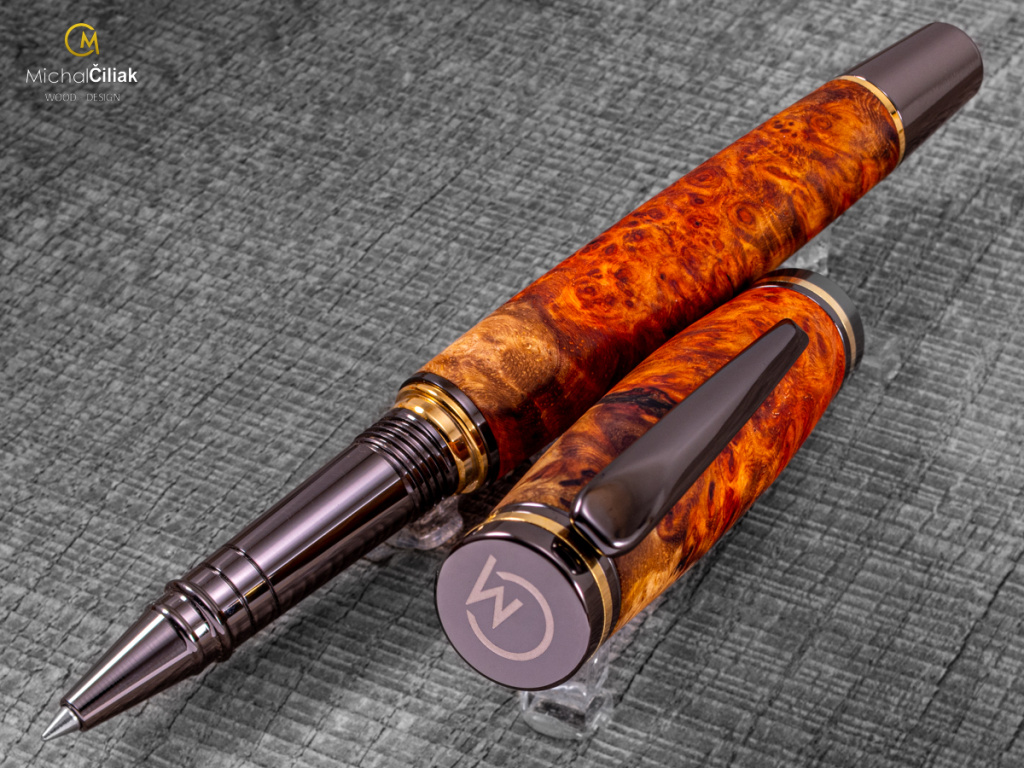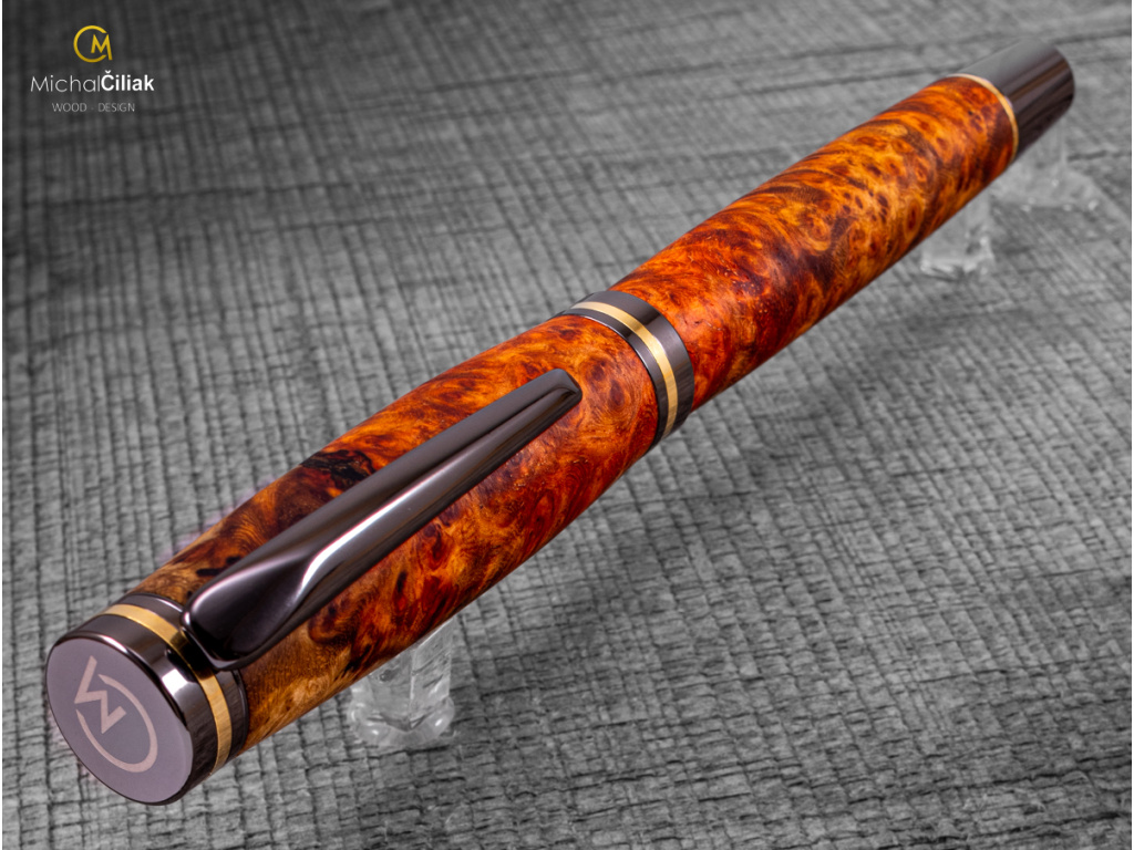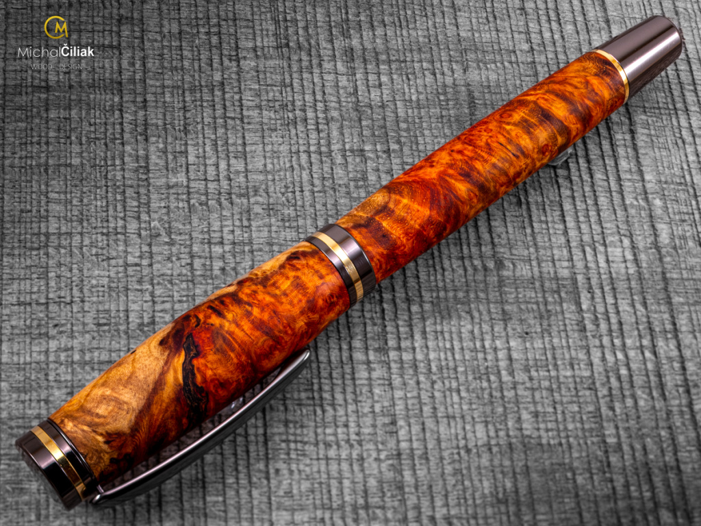 Ručně vyrobené pero z Ambonea Burl wood – luxusní dřevo s jedinečnou kresbou Toto pero je opravdu jedinečné. Ručně jsem ho vyrobil z Ambonea Burl wood, jednoho z nejvzácnějších a nejluxusnějších druhů dřeva na světě, známého svou výraznou kresbou a kontrastními odstíny od zlaté po tmavě červenou. Každý kus je originál – nikdy nenajdete dvě pera se stejnou strukturou dřeva. Ambonea wood pochází z Indonésie, nejčastěji z ostrovů Borneo, Sulawesi a Moluky. Dřevo je tvrdé, odolné a díky pomalému růstu stromů má nádhernou bohatou texturu, která na peru vytváří efektní trojrozměrný vzhled. Proces výroby je náročný – dřevo je pečlivě opracováno a spojeno do finálního tvaru. Každé pero je ručně soustruženo, leštěno a ošetřeno přírodními vosky a oleji. Výsledkem je elegantní, pevné a luxusní pero, které skvěle sedí v ruce a dlouhodobě odolává opotřebení. TIP! Pero z Ambonea Burl wood je perfektní luxusní dárek, který kombinuje jedinečný design a vzácné dřevo. Ideální pro sběratele, milovníky psacích potřeb, nebo jako originální dárek k narozeninám, výročí či významným událostem. Každý kus má svůj jedinečný příběh díky své kresbě a charakteru dřeva. S tímto perem můžete psát své vlastní příběhy nebo ho darovat někomu, kdo ocení skutečný luxus a jedinečnost.