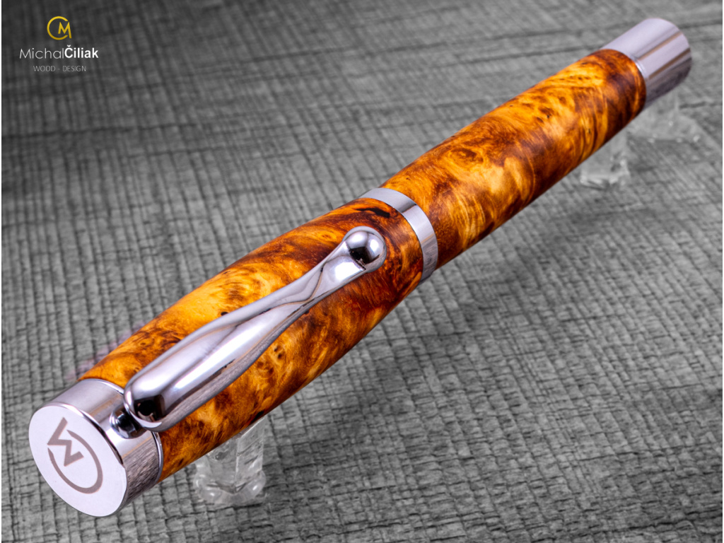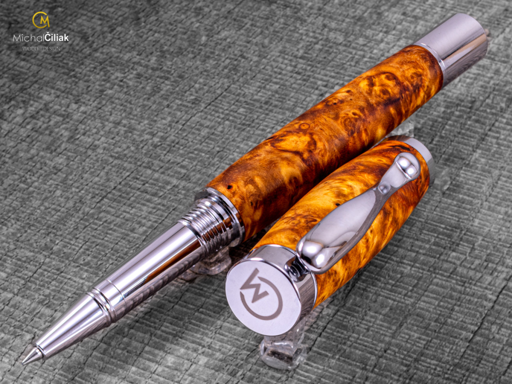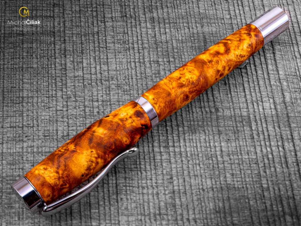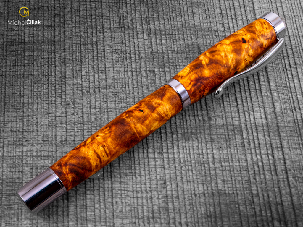 Ručně vyrobené pero z Ambonea Burl wood – luxusní dřevo s jedinečnou kresbou Toto pero je opravdu jedinečné. Ručně jsem ho vyrobil z Ambonea Burl wood, jednoho z nejvzácnějších a nejluxusnějších druhů dřeva na světě, známého svou výraznou kresbou a kontrastními odstíny od zlaté po tmavě červenou. Každý kus je originál – nikdy nenajdete dvě pera se stejnou strukturou dřeva. Ambonea wood pochází z Indonésie, nejčastěji z ostrovů Borneo, Sulawesi a Moluky. Dřevo je tvrdé, odolné a díky pomalému růstu stromů má nádhernou bohatou texturu, která na peru vytváří efektní trojrozměrný vzhled. Proces výroby je náročný – dřevo je pečlivě opracováno a spojeno do finálního tvaru. Každé pero je ručně soustruženo, leštěno a ošetřeno přírodními vosky a oleji. Výsledkem je elegantní, pevné a luxusní pero, které skvěle sedí v ruce a dlouhodobě odolává opotřebení. TIP! Pero z Ambonea Burl wood je perfektní luxusní dárek, který kombinuje jedinečný design a vzácné dřevo. Ideální pro sběratele, milovníky psacích potřeb, nebo jako originální dárek k narozeninám, výročí či významným událostem. Každý kus má svůj jedinečný příběh díky své kresbě a charakteru dřeva. S tímto perem můžete psát své vlastní příběhy nebo ho darovat někomu, kdo ocení skutečný luxus a jedinečnost.