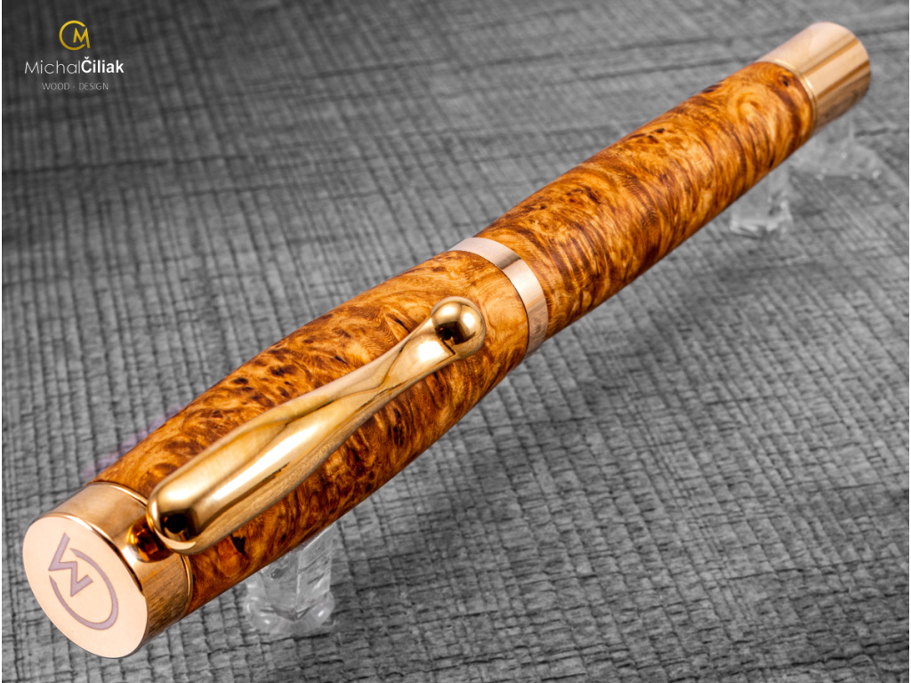 Ručně vyrobené pero z Ambonea Burl wood – luxusní dřevo s jedinečnou kresbou Toto pero je opravdu jedinečné. Ručně jsem ho vyrobil z Ambonea Burl wood, jednoho z nejvzácnějších a nejluxusnějších druhů dřeva na světě, známého svou výraznou kresbou a kontrastními odstíny od zlaté po tmavě červenou. Každý kus je originál – nikdy nenajdete dvě pera se stejnou strukturou dřeva. Ambonea wood pochází z Indonésie, nejčastěji z ostrovů Borneo, Sulawesi a Moluky. Dřevo je tvrdé, odolné a díky pomalému růstu stromů má nádhernou bohatou texturu, která na peru vytváří efektní trojrozměrný vzhled. Proces výroby je náročný – dřevo je pečlivě opracováno a spojeno do finálního tvaru. Každé pero je ručně soustruženo, leštěno a ošetřeno přírodními vosky a oleji. Výsledkem je elegantní, pevné a luxusní pero, které skvěle sedí v ruce a dlouhodobě odolává opotřebení. TIP! Pero z Ambonea Burl wood je perfektní luxusní dárek, který kombinuje jedinečný design a vzácné dřevo. Ideální pro sběratele, milovníky psacích potřeb, nebo jako originální dárek k narozeninám, výročí či významným událostem. Každý kus má svůj jedinečný příběh díky své kresbě a charakteru dřeva. S tímto perem můžete psát své vlastní příběhy nebo ho darovat někomu, kdo ocení skutečný luxus a jedinečnost.