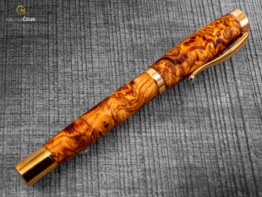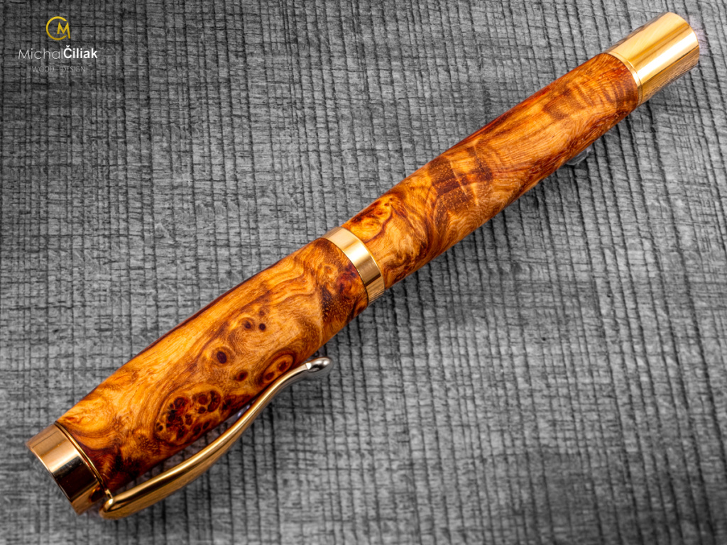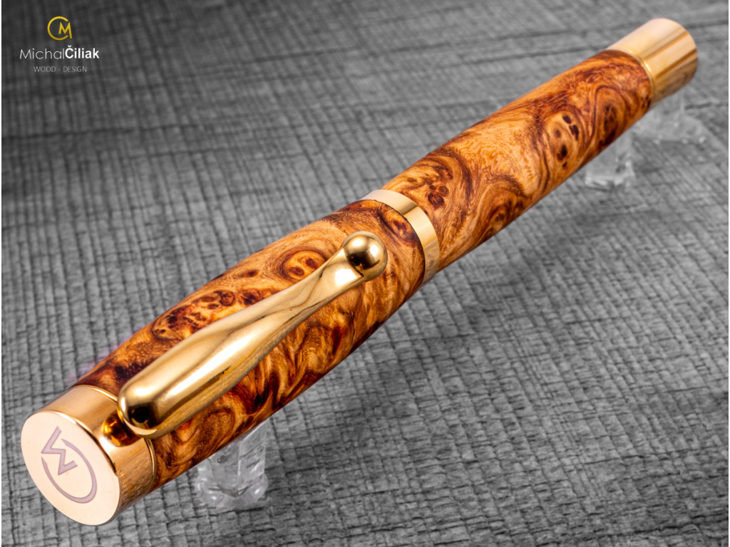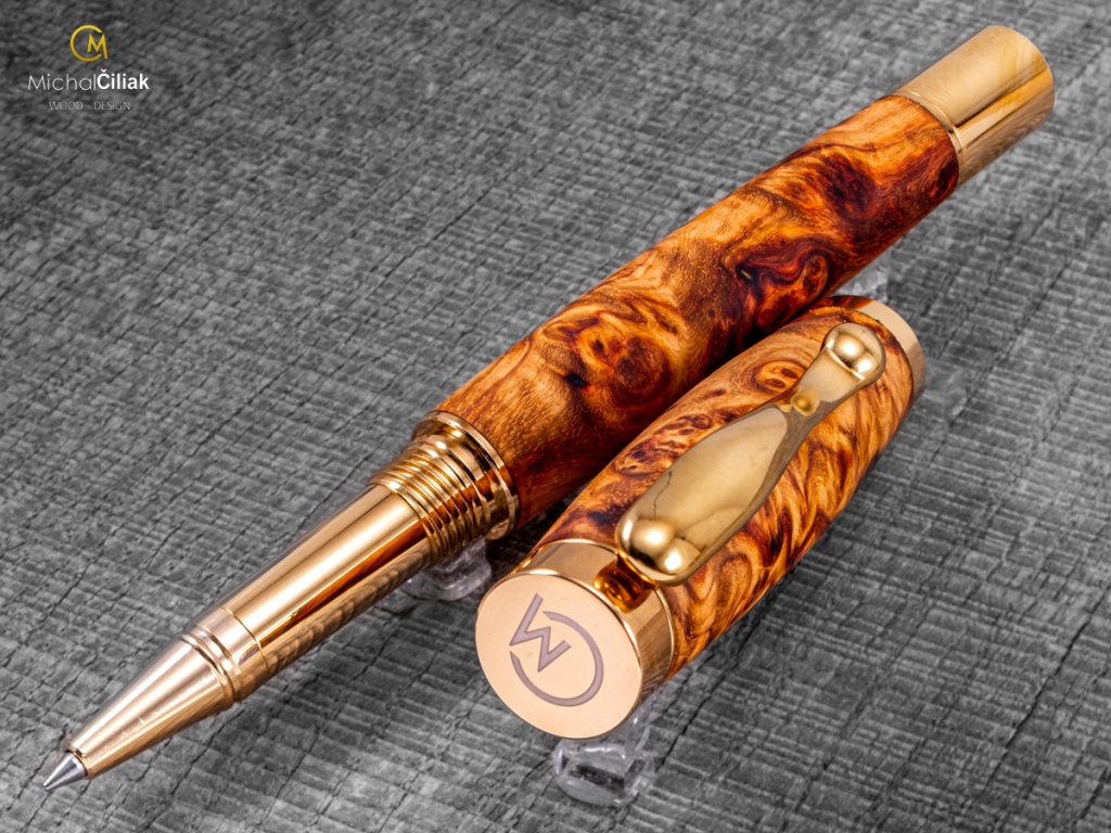 Ručně vyrobené pero z Ambonea Burl wood – luxusní dřevo s jedinečnou kresbou Toto pero je opravdu jedinečné. Ručně jsem ho vyrobil z Ambonea Burl wood, jednoho z nejvzácnějších a nejluxusnějších druhů dřeva na světě, známého svou výraznou kresbou a kontrastními odstíny od zlaté po tmavě červenou. Každý kus je originál – nikdy nenajdete dvě pera se stejnou strukturou dřeva. Ambonea wood pochází z Indonésie, nejčastěji z ostrovů Borneo, Sulawesi a Moluky. Dřevo je tvrdé, odolné a díky pomalému růstu stromů má nádhernou bohatou texturu, která na peru vytváří efektní trojrozměrný vzhled. Proces výroby je náročný – dřevo je pečlivě opracováno a spojeno do finálního tvaru. Každé pero je ručně soustruženo, leštěno a ošetřeno přírodními vosky a oleji. Výsledkem je elegantní, pevné a luxusní pero, které skvěle sedí v ruce a dlouhodobě odolává opotřebení. TIP! Pero z Ambonea Burl wood je perfektní luxusní dárek, který kombinuje jedinečný design a vzácné dřevo. Ideální pro sběratele, milovníky psacích potřeb, nebo jako originální dárek k narozeninám, výročí či významným událostem. Každý kus má svůj jedinečný příběh díky své kresbě a charakteru dřeva. S tímto perem můžete psát své vlastní příběhy nebo ho darovat někomu, kdo ocení skutečný luxus a jedinečnost.
