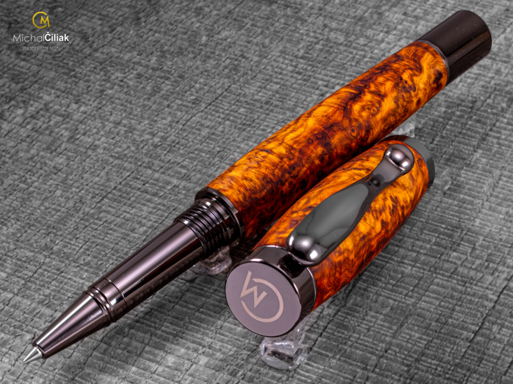 Ručně vyrobené pero z Ambonea Burl wood – luxusní dřevo s jedinečnou kresbou Toto pero je opravdu jedinečné. Ručně jsem ho vyrobil z Ambonea Burl wood, jednoho z nejvzácnějších a nejluxusnějších druhů dřeva na světě, známého svou výraznou kresbou a kontrastními odstíny od zlaté po tmavě červenou. Každý kus je originál – nikdy nenajdete dvě pera se stejnou strukturou dřeva. Ambonea wood pochází z Indonésie, nejčastěji z ostrovů Borneo, Sulawesi a Moluky. Dřevo je tvrdé, odolné a díky pomalému růstu stromů má nádhernou bohatou texturu, která na peru vytváří efektní trojrozměrný vzhled. Proces výroby je náročný – dřevo je pečlivě opracováno a spojeno do finálního tvaru. Každé pero je ručně soustruženo, leštěno a ošetřeno přírodními vosky a oleji. Výsledkem je elegantní, pevné a luxusní pero, které skvěle sedí v ruce a dlouhodobě odolává opotřebení. TIP! Pero z Ambonea Burl wood je perfektní luxusní dárek, který kombinuje jedinečný design a vzácné dřevo. Ideální pro sběratele, milovníky psacích potřeb, nebo jako originální dárek k narozeninám, výročí či významným událostem. Každý kus má svůj jedinečný příběh díky své kresbě a charakteru dřeva. S tímto perem můžete psát své vlastní příběhy nebo ho darovat někomu, kdo ocení skutečný luxus a jedinečnost.