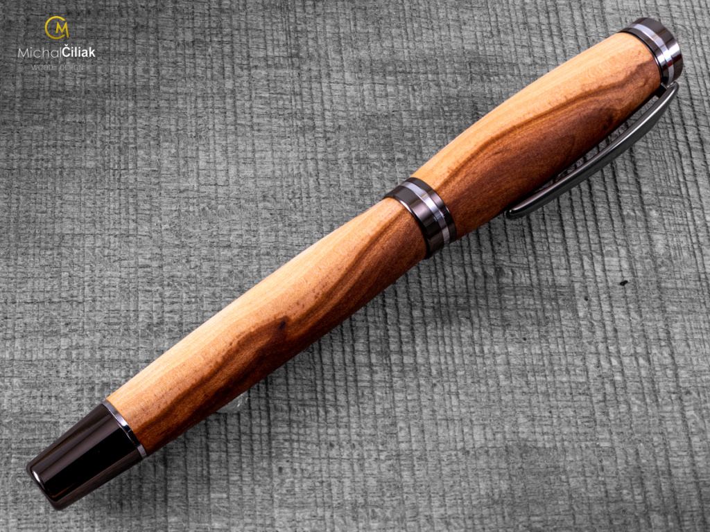 Ručně vyrobeno z českého jabloňového dřeva, jehož jádro - ze kterého je pero vyrobeno - má světle až tmavě hnědou barvu s výraznější kresbou s barevnými kontrasty. Kombinace tmavě a světle hnědé barvy dělá z pera velkého elegána s potřebnou dávkou výraznosti.