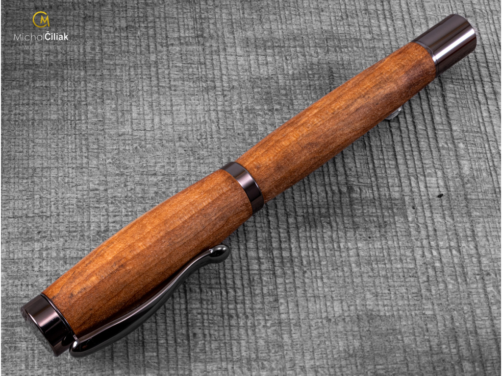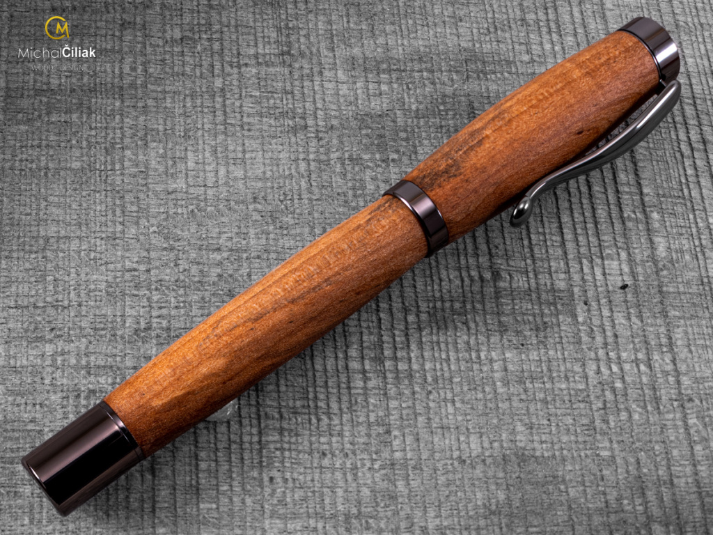Ručně vyrobeno z českého jabloňového dřeva, jehož jádro - ze kterého je pero vyrobeno - má světle až tmavě hnědou barvu s výraznější kresbou s barevnými kontrasty. Kombinace tmavě a světle hnědé barvy dělá z pera velkého elegána s potřebnou dávkou výraznosti.