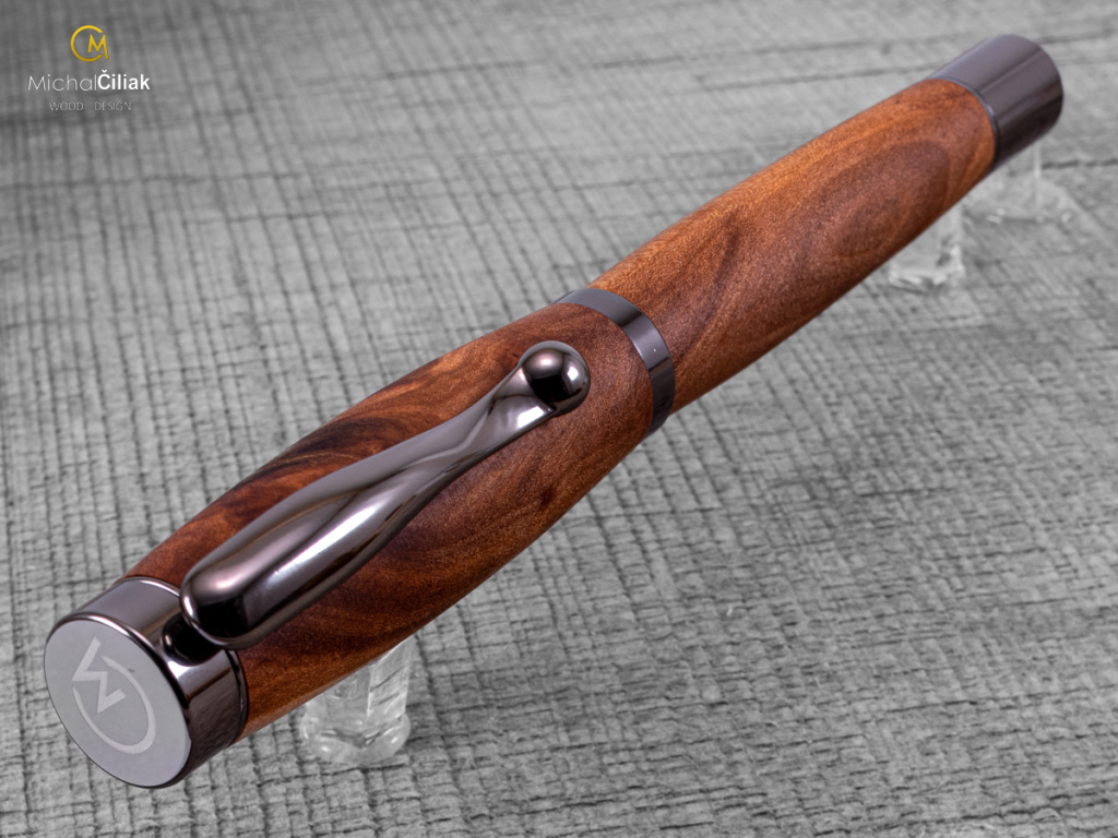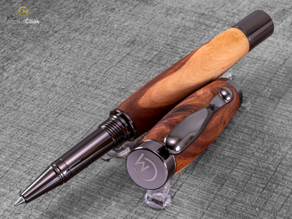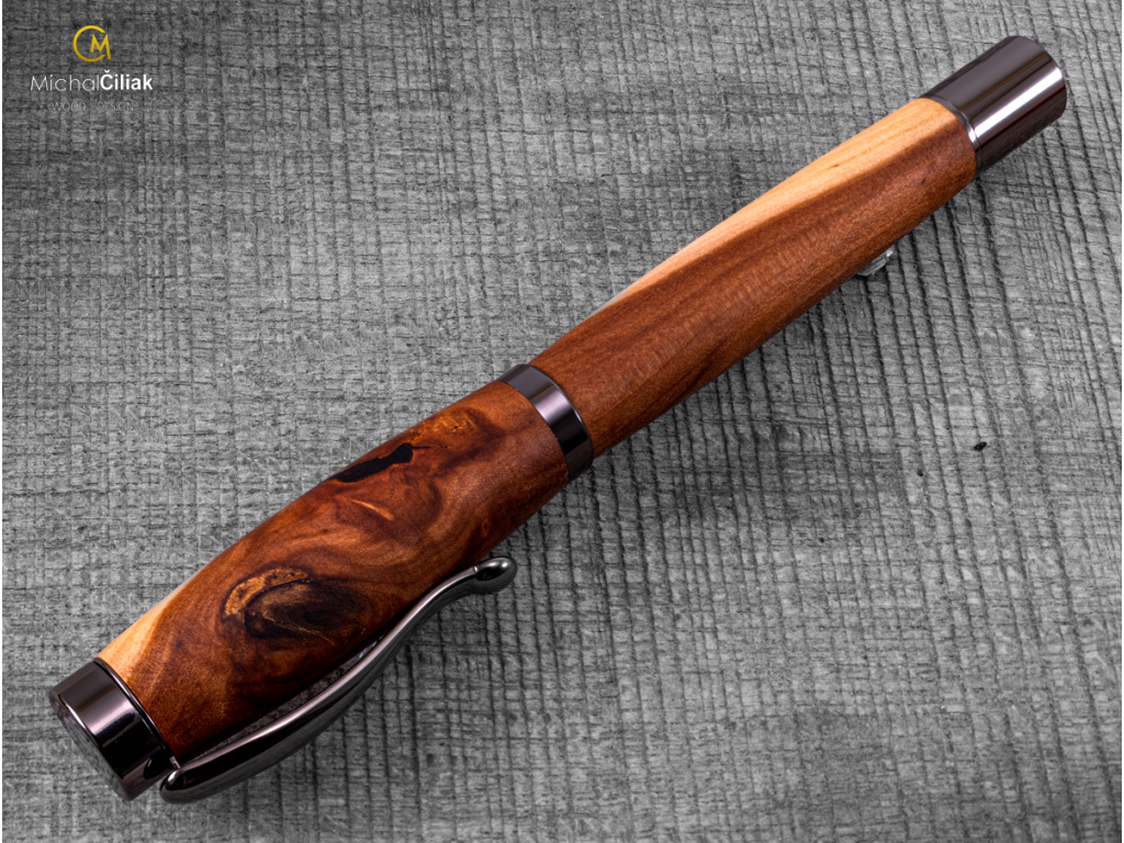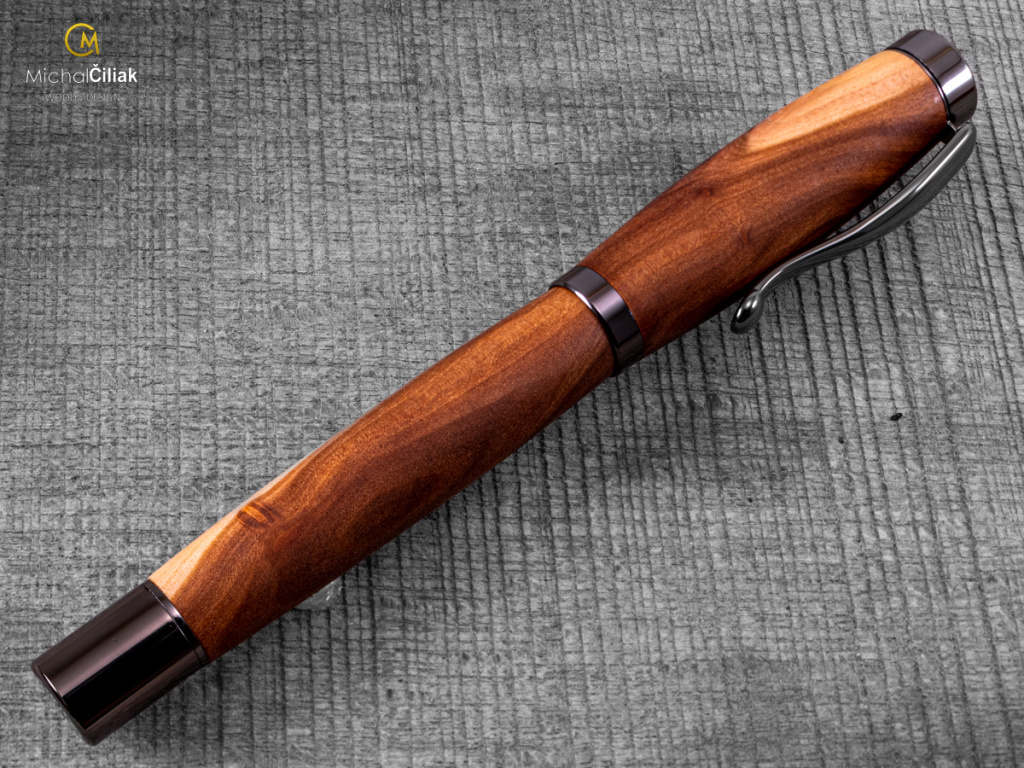 Ručně vyrobeno z českého jabloňového dřeva, jehož jádro - ze kterého je pero vyrobeno - má světle až tmavě hnědou barvu s výraznější kresbou s barevnými kontrasty. Kombinace tmavě a světle hnědé barvy dělá z pera velkého elegána s potřebnou dávkou výraznosti.