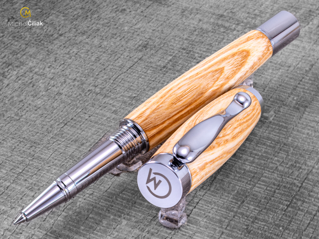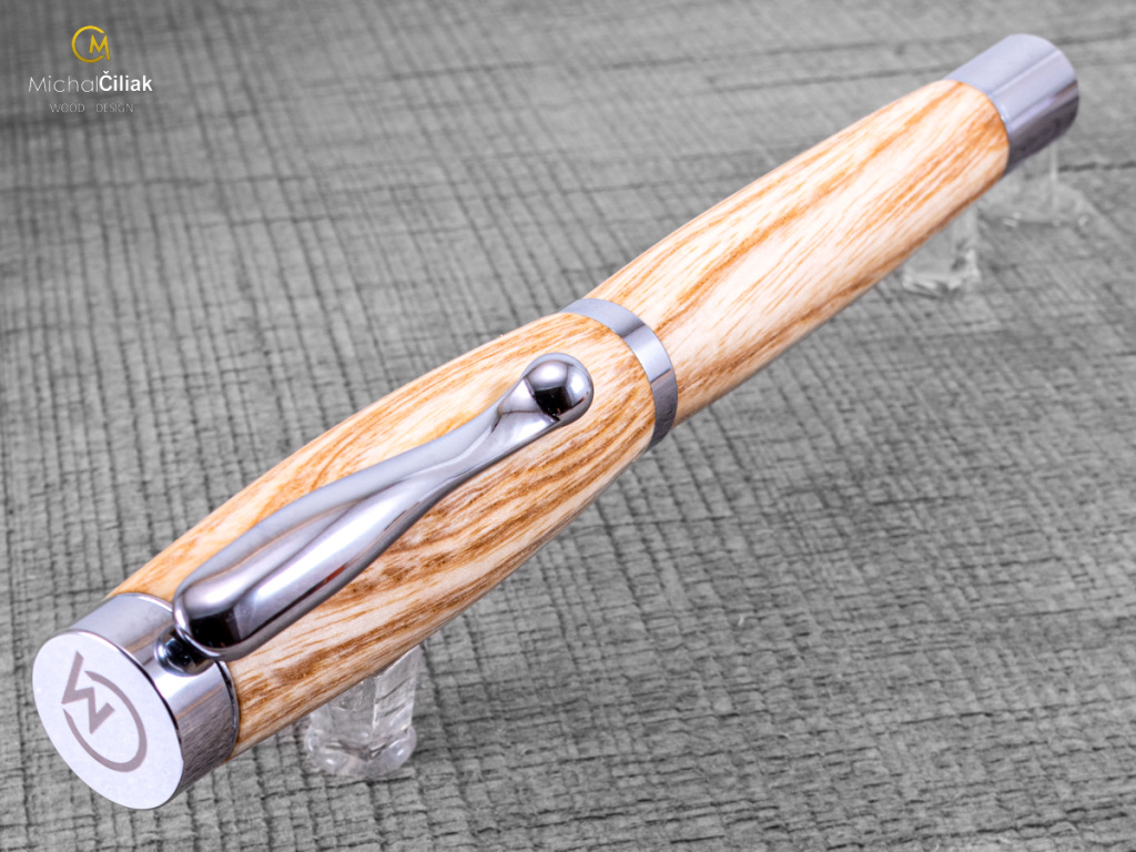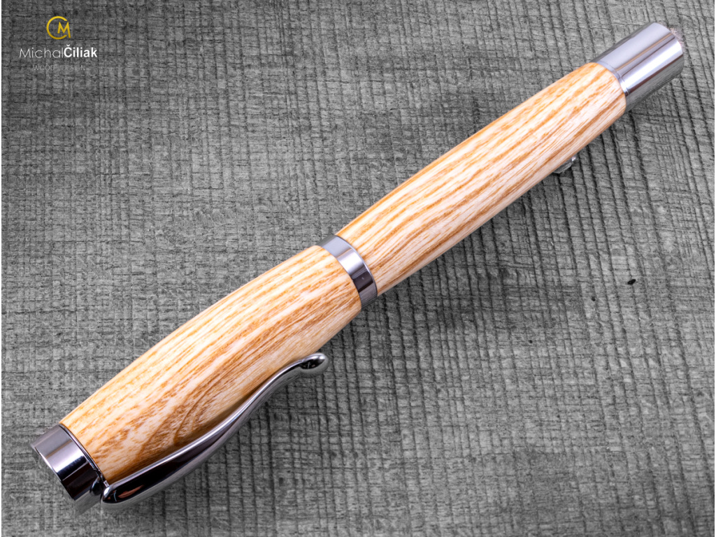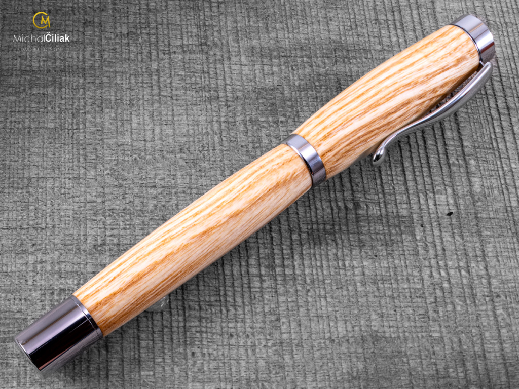 Ručně vyrobeno z českého jasanu, jehož dřevo je tvrdé a zároveň velmi pružné, patří k nejpružnějším českým dřevinám. Jádro jasanu je světle hnědé a má velmi výrazné letokruhy. Z tohoto důvodu je výběr dřeva velmi důležitý, protože některé kusy jasanového dřeva mají letokruhy hodně zajímavě tvarované a toto pero je toho důkazem. Vypadá až uměle, ale věřte, že jeho dřevo je dílem přírody.