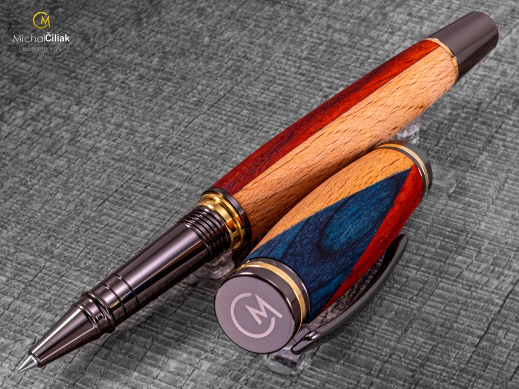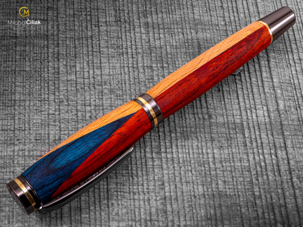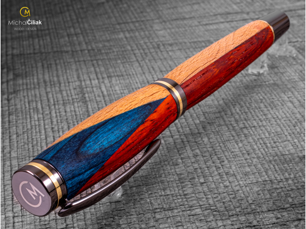 Ručně vyrobené pero v barvách české vlajky – africký padouk, buk a modrá dýha Toto luxusní dřevěné pero je originál, který propojuje českou tradici, precizní řemeslnou práci a národní symboliku. Ručně jsem ho vyrobil z trojice dřevin – bílého buku, červeného afrického padouku a modře barvené dýhy, které dohromady tvoří barvy české vlajky. Každý kus je jedinečný a nese vlastní příběh. Bílá část pera je z českého buku – jemné, pevné a ikonické dřevo s krásnou přirozenou kresbou. Červený africký padouk dodává peru výrazný teplý tón, pevnost a luxusní vzhled. Modrá část je tvořena speciálně barvenou dýhou, která zachovává přirozenou strukturu dřeva a dodává sytý modrý odstín. Proces výroby je náročný a každý krok je proveden ručně. Dřevo je pečlivě vybíráno, vysušeno, přesně spojeno a soustruženo do finálního tvaru, který evokuje českou vlajku. Finální povrch pera je ručně leštěný a ošetřený přírodními vosky a oleji, takže pero nejen krásně vypadá, ale je také příjemné v ruce a dlouhodobě odolné. TIP! Toto pero je ideální jako luxusní dárek pro každého, kdo miluje českou tradici, design a originální řemeslo. Skvělé k narozeninám, výročí, maturitě nebo jako jedinečný firemní dárek. Podívejte se, jak vzniká – každý kus je originál s vlastním příběhem. Pište s ním své vlastní příběhy nebo darujte jako opravdu jedinečný dárek.