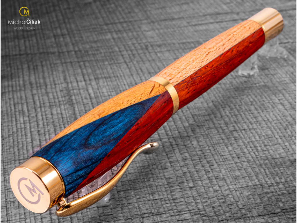 Ručně vyrobeno Česká vlajka – dřevěné pero - varianta Elegant s kovovými komponenty zlaté barvy