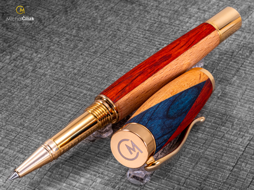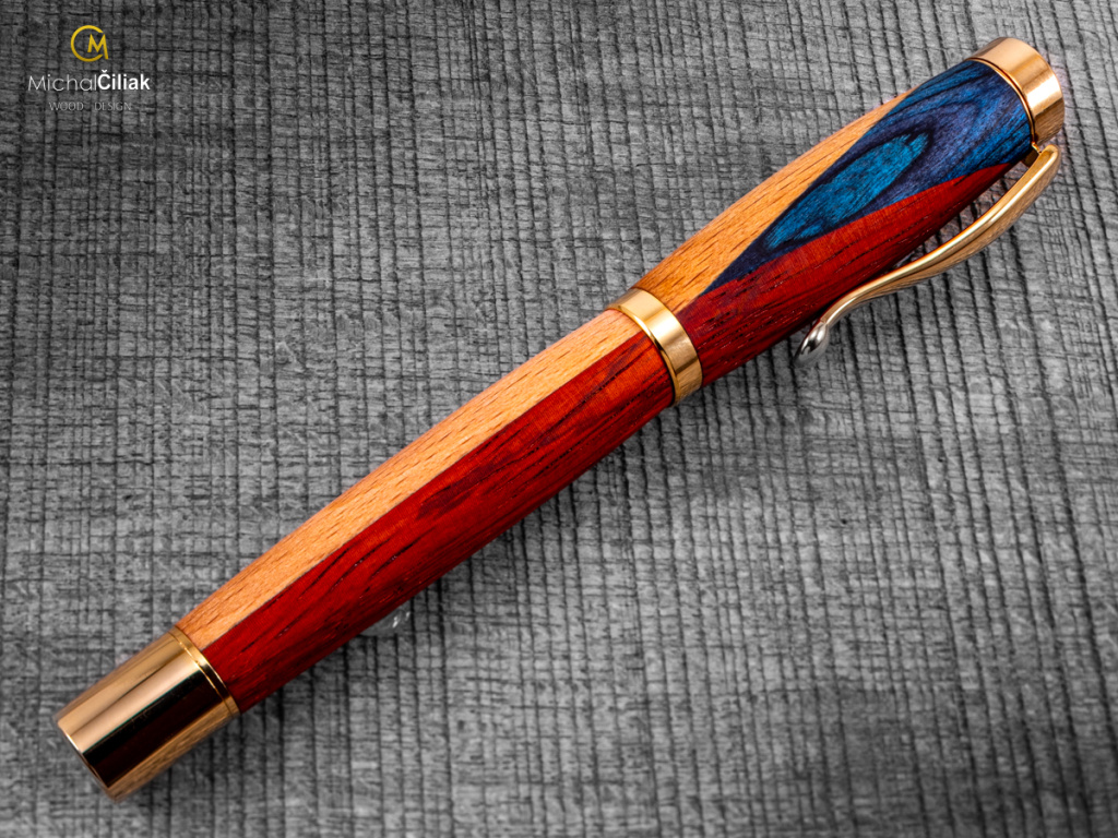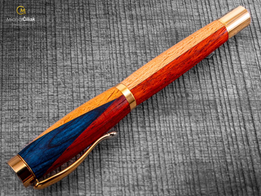 Ručně vyrobené pero v barvách české vlajky – africký padouk, buk a modrá dýha Toto luxusní dřevěné pero je originál, který propojuje českou tradici, precizní řemeslnou práci a národní symboliku. Ručně jsem ho vyrobil z trojice dřevin – bílého buku, červeného afrického padouku a modře barvené dýhy, které dohromady tvoří barvy české vlajky. Každý kus je jedinečný a nese vlastní příběh. Bílá část pera je z českého buku – jemné, pevné a ikonické dřevo s krásnou přirozenou kresbou. Červený africký padouk dodává peru výrazný teplý tón, pevnost a luxusní vzhled. Modrá část je tvořena speciálně barvenou dýhou, která zachovává přirozenou strukturu dřeva a dodává sytý modrý odstín. Proces výroby je náročný a každý krok je proveden ručně. Dřevo je pečlivě vybíráno, vysušeno, přesně spojeno a soustruženo do finálního tvaru, který evokuje českou vlajku. Finální povrch pera je ručně leštěný a ošetřený přírodními vosky a oleji, takže pero nejen krásně vypadá, ale je také příjemné v ruce a dlouhodobě odolné. TIP! Toto pero je ideální jako luxusní dárek pro každého, kdo miluje českou tradici, design a originální řemeslo. Skvělé k narozeninám, výročí, maturitě nebo jako jedinečný firemní dárek. Podívejte se, jak vzniká – každý kus je originál s vlastním příběhem. Pište s ním své vlastní příběhy nebo darujte jako opravdu jedinečný dárek.