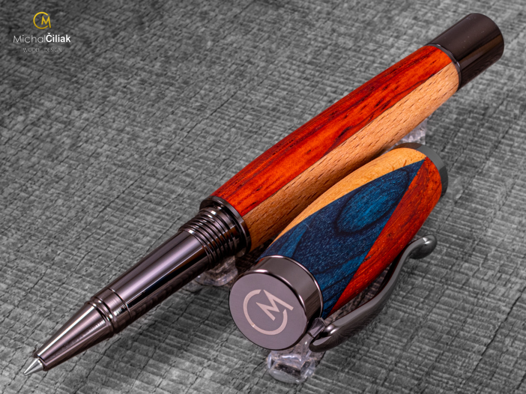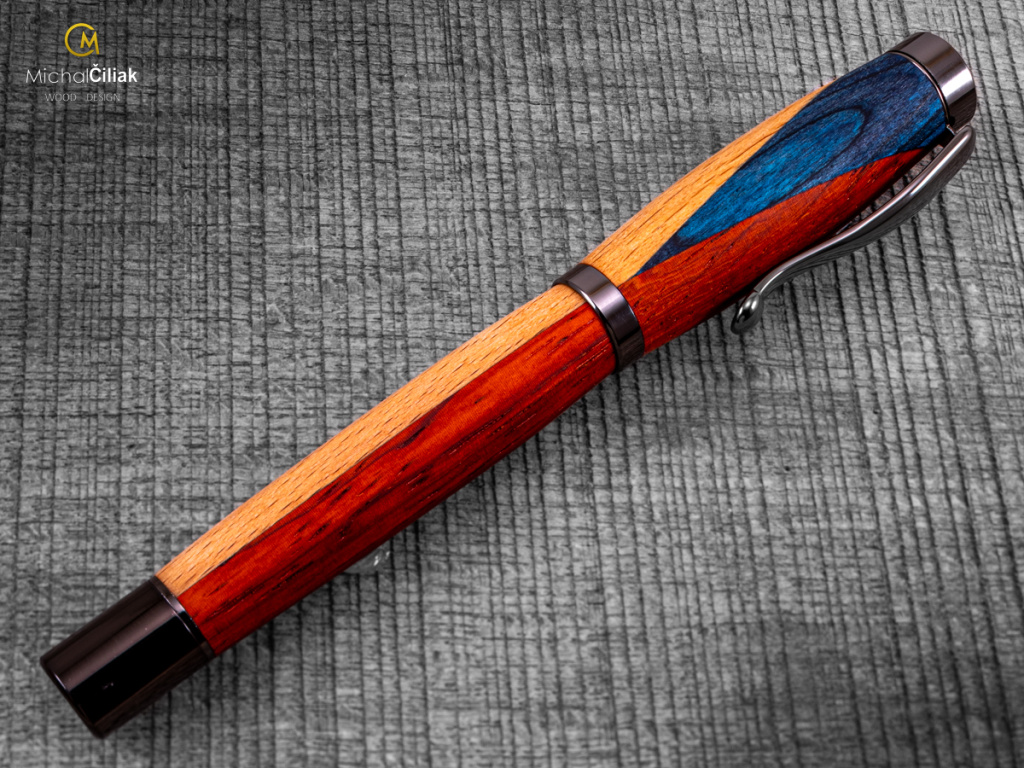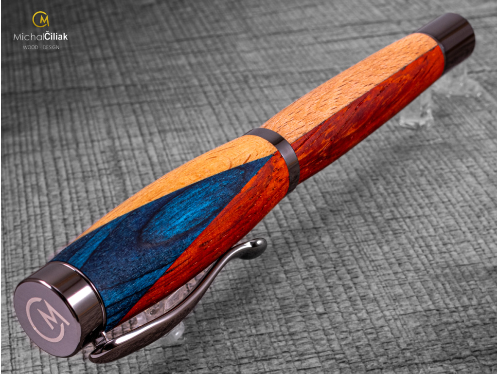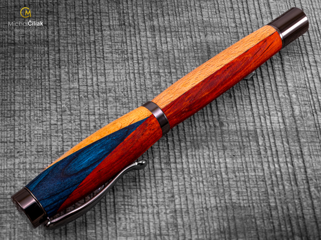 Ručně vyrobené pero v barvách české vlajky – africký padouk, buk a modrá dýha Toto luxusní dřevěné pero je originál, který propojuje českou tradici, precizní řemeslnou práci a národní symboliku. Ručně jsem ho vyrobil z trojice dřevin – bílého buku, červeného afrického padouku a modře barvené dýhy, které dohromady tvoří barvy české vlajky. Každý kus je jedinečný a nese vlastní příběh. Bílá část pera je z českého buku – jemné, pevné a ikonické dřevo s krásnou přirozenou kresbou. Červený africký padouk dodává peru výrazný teplý tón, pevnost a luxusní vzhled. Modrá část je tvořena speciálně barvenou dýhou, která zachovává přirozenou strukturu dřeva a dodává sytý modrý odstín. Proces výroby je náročný a každý krok je proveden ručně. Dřevo je pečlivě vybíráno, vysušeno, přesně spojeno a soustruženo do finálního tvaru, který evokuje českou vlajku. Finální povrch pera je ručně leštěný a ošetřený přírodními vosky a oleji, takže pero nejen krásně vypadá, ale je také příjemné v ruce a dlouhodobě odolné. TIP! Toto pero je ideální jako luxusní dárek pro každého, kdo miluje českou tradici, design a originální řemeslo. Skvělé k narozeninám, výročí, maturitě nebo jako jedinečný firemní dárek. Podívejte se, jak vzniká – každý kus je originál s vlastním příběhem. Pište s ním své vlastní příběhy nebo darujte jako opravdu jedinečný dárek.