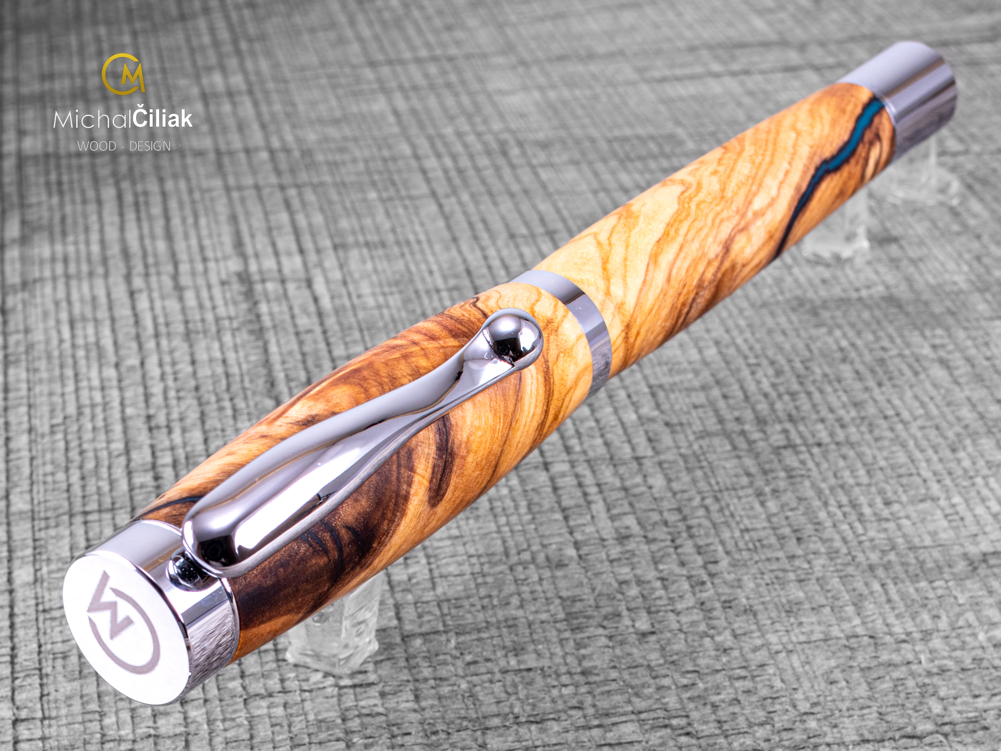 Toto ručně vyráběné pero vzniká z výběrového olivového dřeva stabilizovaného barvenou pryskyřicí. Tento proces umožňuje využít i výrazně strukturované kusy dřeva s přirozenými prasklinami, které jsou pryskyřicí vyplněny, zpevněny a přetvořeny v jedinečný designový prvek. Každé pero je díky tomu naprostý originál.