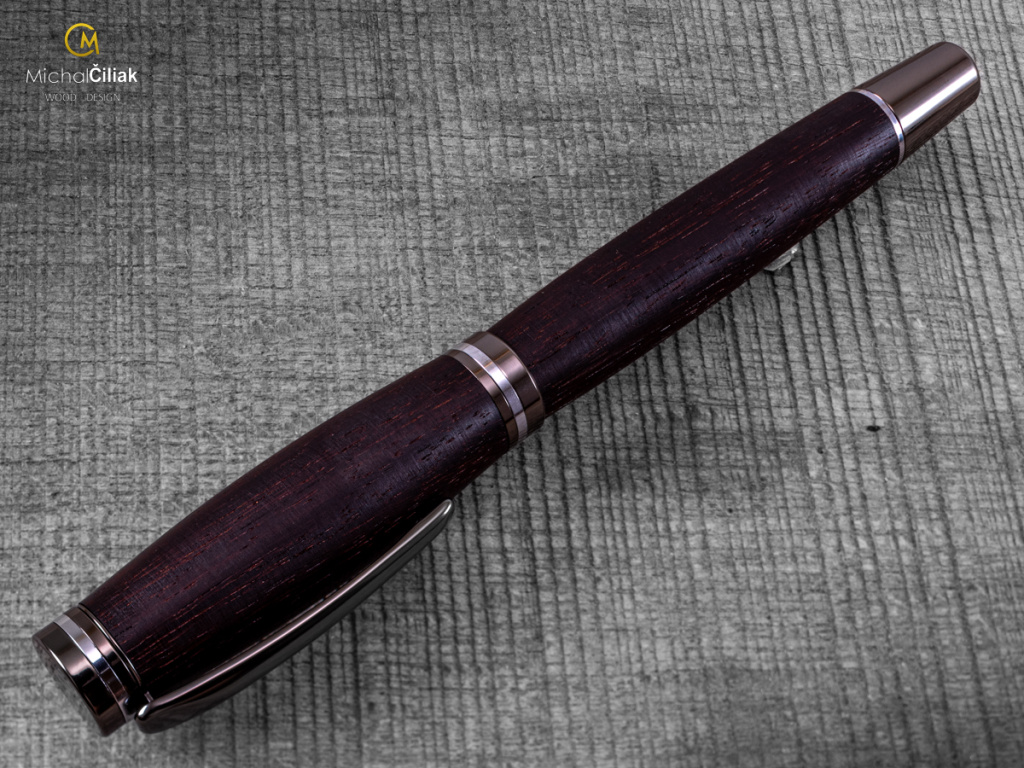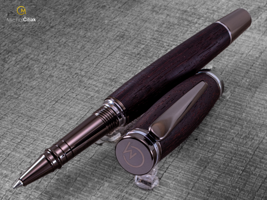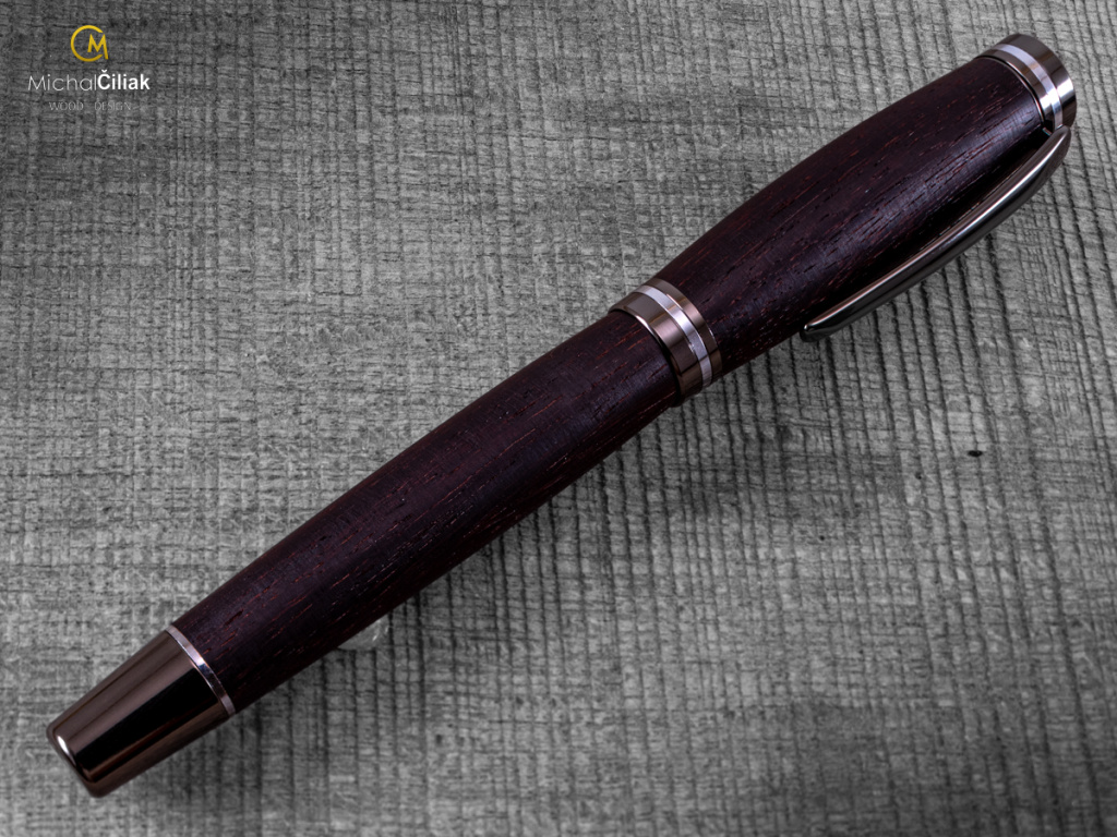 Ručně vyrobeno z prvotřídního palisandrového dřeva a barvené pryskyřice. Palisandr je ceněný pro svou vysokou hustotu, pevnost a nádhernou kresbu, která kombinuje temně hnědé odstíny s černými či fialovými pruhy. Typickým znakem je i jeho jemná, sladce kořeněná vůně, díky které se mu v angličtině říká rosewood. Pochází z tropických oblastí a odedávna byl využíván pro výrobu luxusního nábytku, hudebních nástrojů a uměleckých předmětů. V kombinaci s čirou barvenou pryskyřicí tak vzniká jedinečný materiál, ze kterého soustružím pera s opravdu originálním vzhledem. Každý kus je naprostý unikát – přírodní kresba dřeva spolu s pryskyřicí tvoří neopakovatelný vzor.