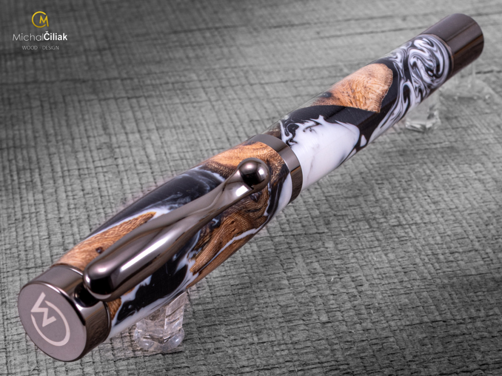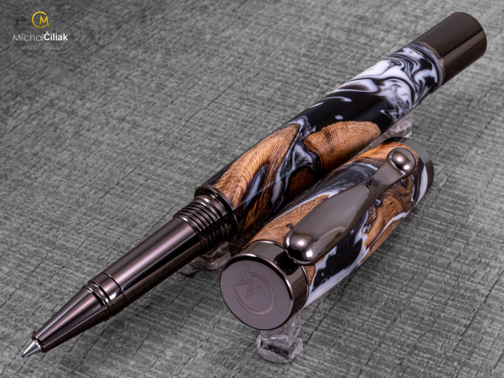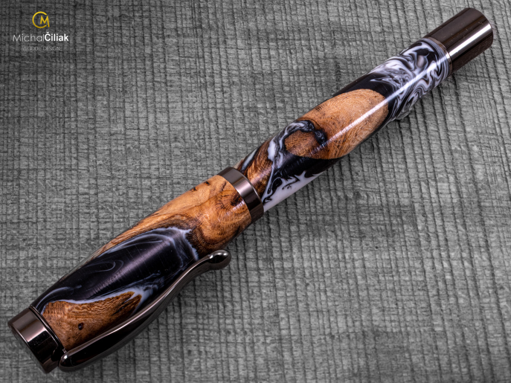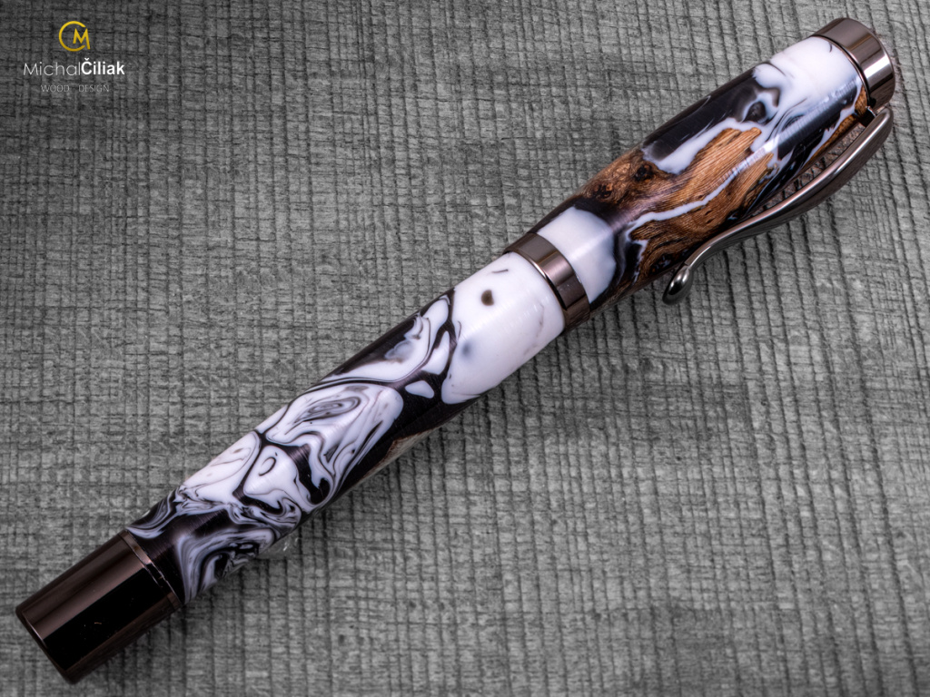 Ručně vyrobeno ze dřeva vinné révy a barvené pryskyřice. Proces výroby je poměrně složitý, je potřeba vysušených zdřevnatělých kmínků vinné révy, které se pak zalijí speciální čirou pryskyřicí dobarvenou perleťovými barvami. Po zalití je nutné z pryskyřice dostat bublinky. Nastupuje proces, kdy se pryskyřice se dřevem vloží do tlakové nádoby a pomocí tlaku 6 bar se bublinky pomalu vytlačují na povrch. Nechá se finálně zatvrdnout a pak se celý bloček, naformátuje na malé hranoly, ze kterých následně soustružím tato nádherná a zajímavá pera.