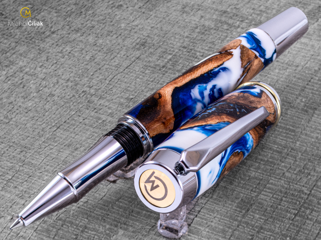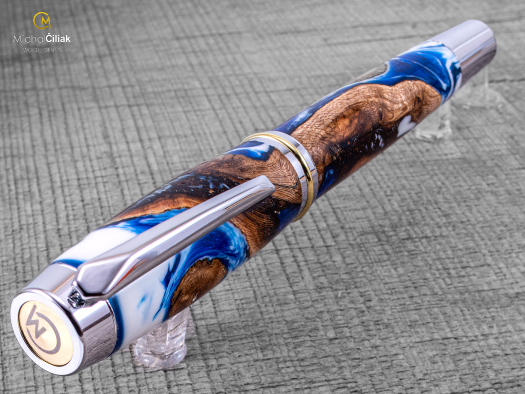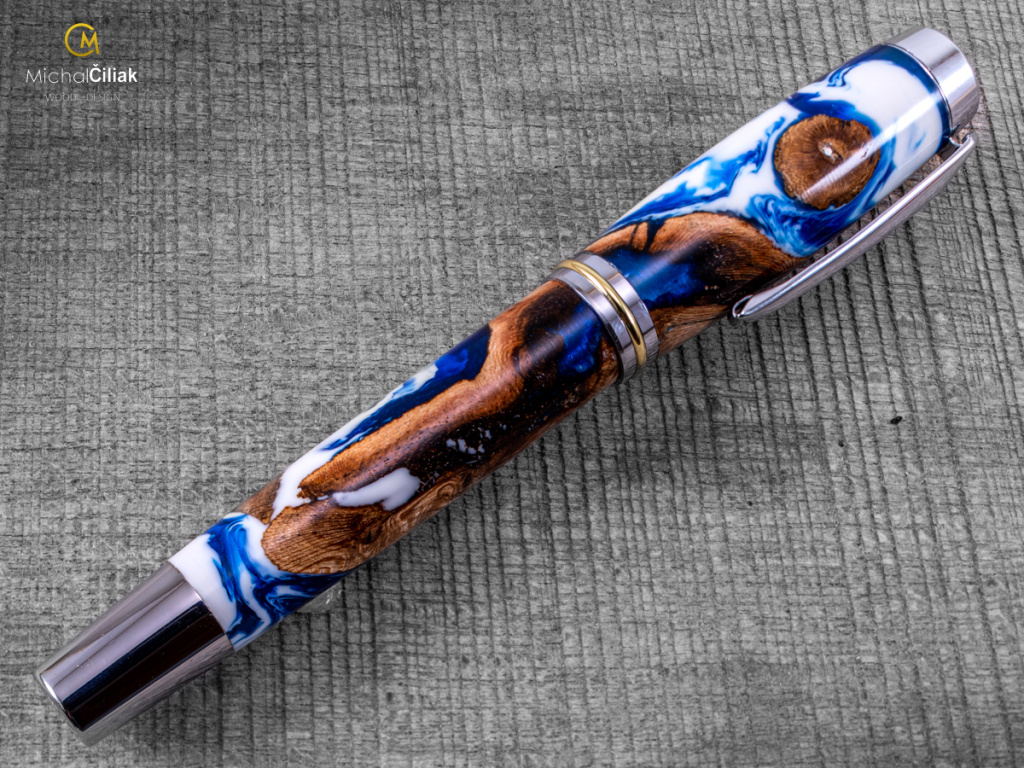 Ručně vyrobeno ze dřeva vinné révy a barvené pryskyřice. Proces výroby je poměrně složitý, je potřeba vysušených zdřevnatělých kmínků vinné révy, které se pak zalijí speciální čirou pryskyřicí dobarvenou perleťovými barvami. Po zalití je nutné z pryskyřice dostat bublinky. Nastupuje proces, kdy se pryskyřice se dřevem vloží do tlakové nádoby a pomocí tlaku 6 bar se bublinky pomalu vytlačují na povrch. Nechá se finálně zatvrdnout a pak se celý bloček, naformátuje na malé hranoly, ze kterých následně soustružím tato nádherná a zajímavá pera.