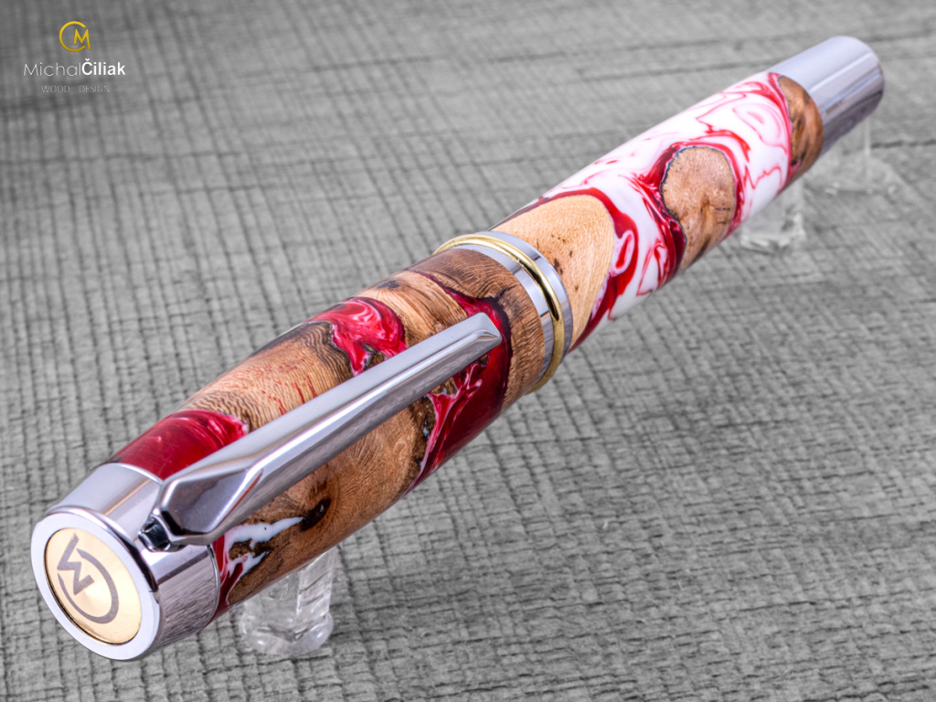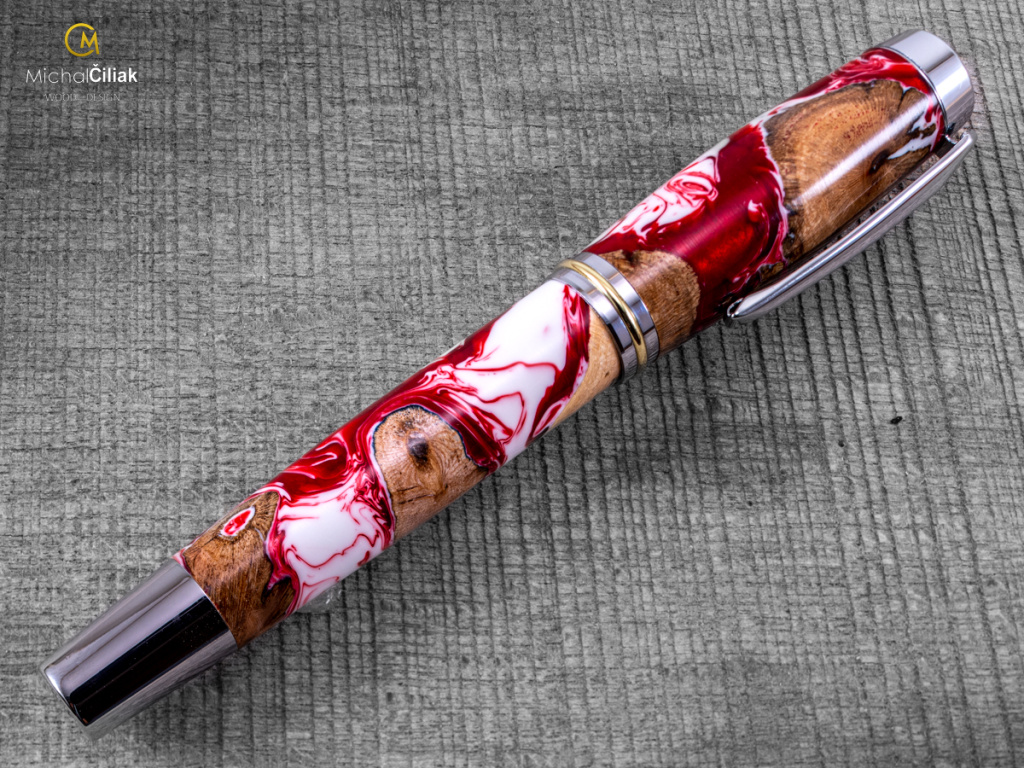 Ručně vyrobeno ze dřeva vinné révy a barvené pryskyřice. Proces výroby je poměrně složitý, je potřeba vysušených zdřevnatělých kmínků vinné révy, které se pak zalijí speciální čirou pryskyřicí dobarvenou perleťovými barvami. Po zalití je nutné z pryskyřice dostat bublinky. Nastupuje proces, kdy se pryskyřice se dřevem vloží do tlakové nádoby a pomocí tlaku 6 bar se bublinky pomalu vytlačují na povrch. Nechá se finálně zatvrdnout a pak se celý bloček, naformátuje na malé hranoly, ze kterých následně soustružím tato nádherná a zajímavá pera.