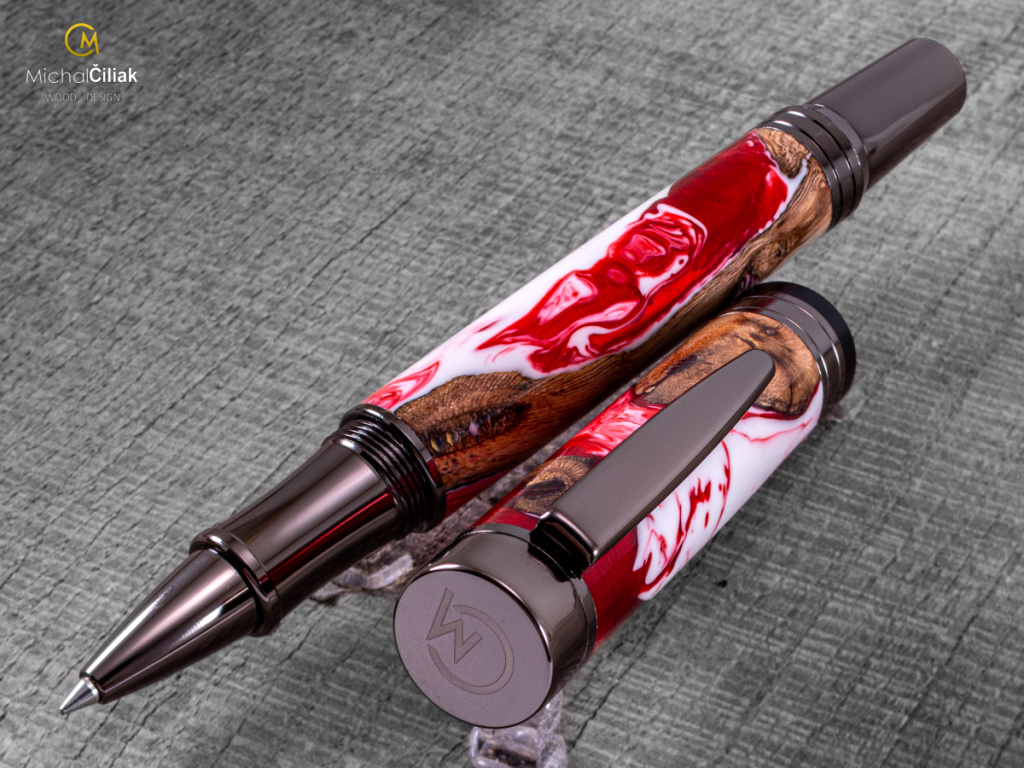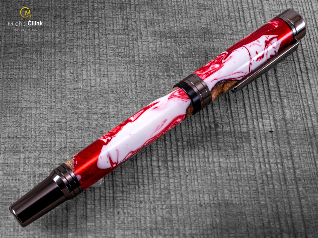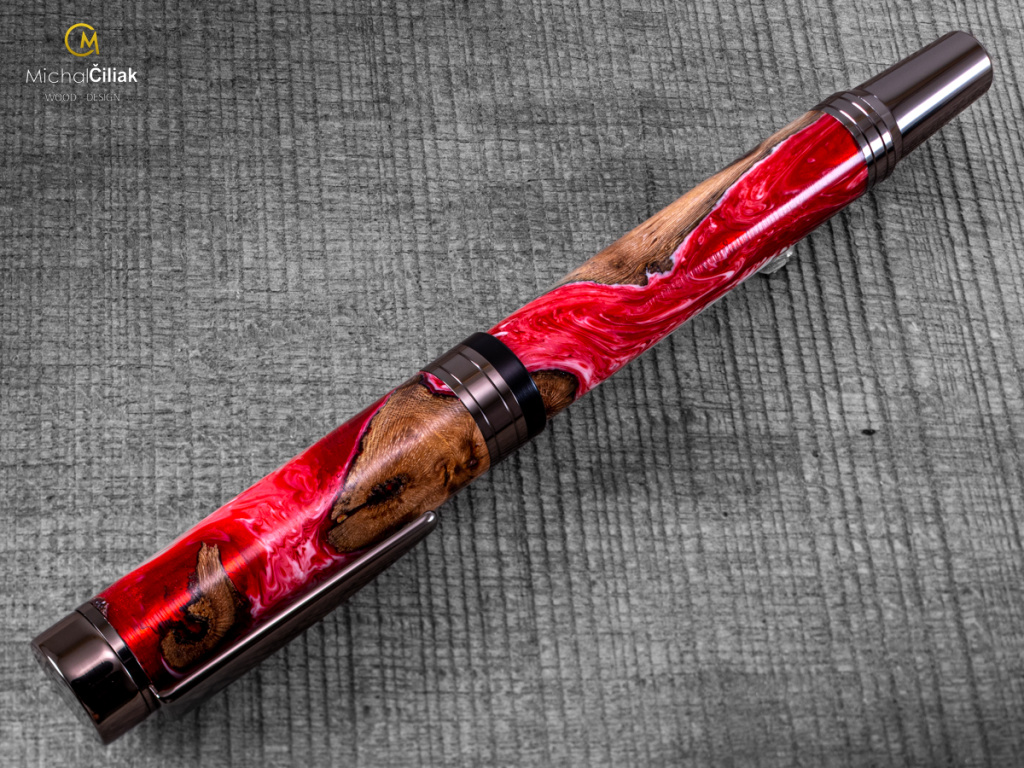 Ručně vyrobeno ze dřeva vinné révy a barvené pryskyřice. Proces výroby je poměrně složitý, je potřeba vysušených zdřevnatělých kmínků vinné révy, které se pak zalijí speciální čirou pryskyřicí dobarvenou perleťovými barvami. Po zalití je nutné z pryskyřice dostat bublinky. Nastupuje proces, kdy se pryskyřice se dřevem vloží do tlakové nádoby a pomocí tlaku 6 bar se bublinky pomalu vytlačují na povrch. Nechá se finálně zatvrdnout a pak se celý bloček, naformátuje na malé hranoly, ze kterých následně soustružím tato nádherná a zajímavá pera.
