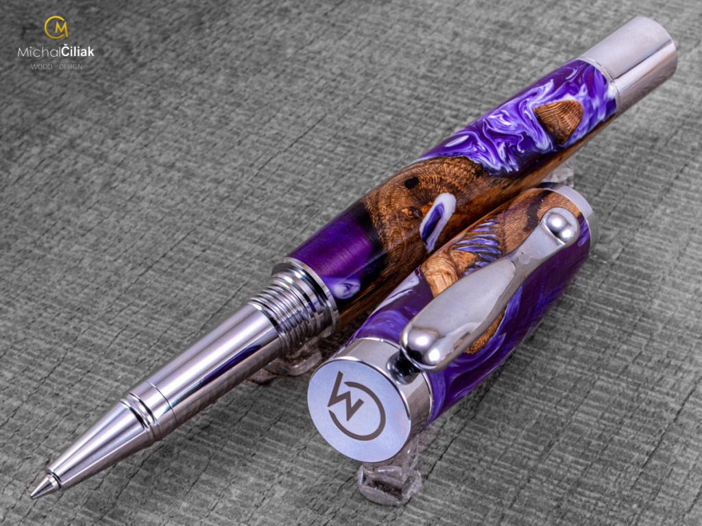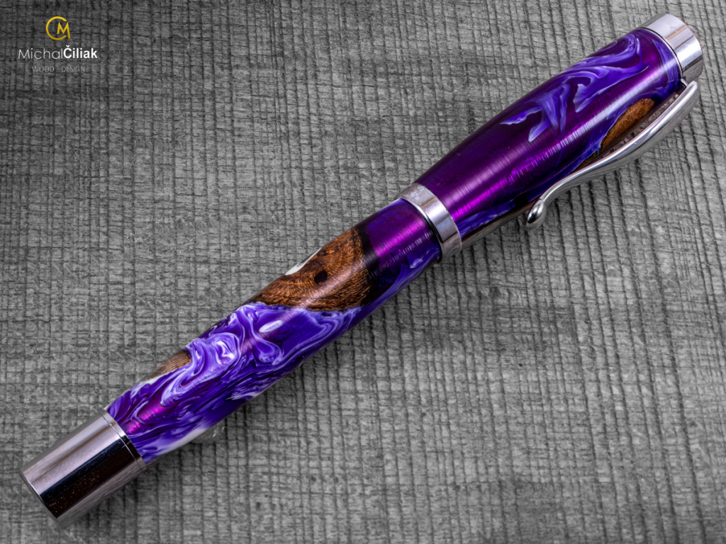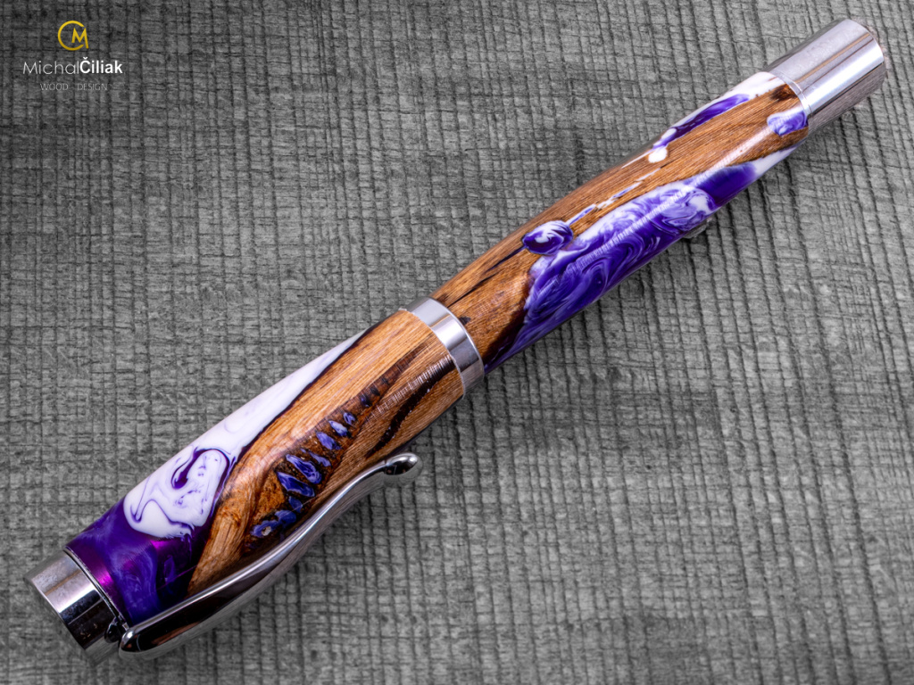 Ručně vyrobeno ze dřeva vinné révy a barvené pryskyřice. Proces výroby je poměrně složitý, je potřeba vysušených zdřevnatělých kmínků vinné révy, které se pak zalijí speciální čirou pryskyřicí dobarvenou perleťovými barvami. Po zalití je nutné z pryskyřice dostat bublinky. Nastupuje proces, kdy se pryskyřice se dřevem vloží do tlakové nádoby a pomocí tlaku 6 bar se bublinky pomalu vytlačují na povrch. Nechá se finálně zatvrdnout a pak se celý bloček, naformátuje na malé hranoly, ze kterých následně soustružím tato nádherná a zajímavá pera.
