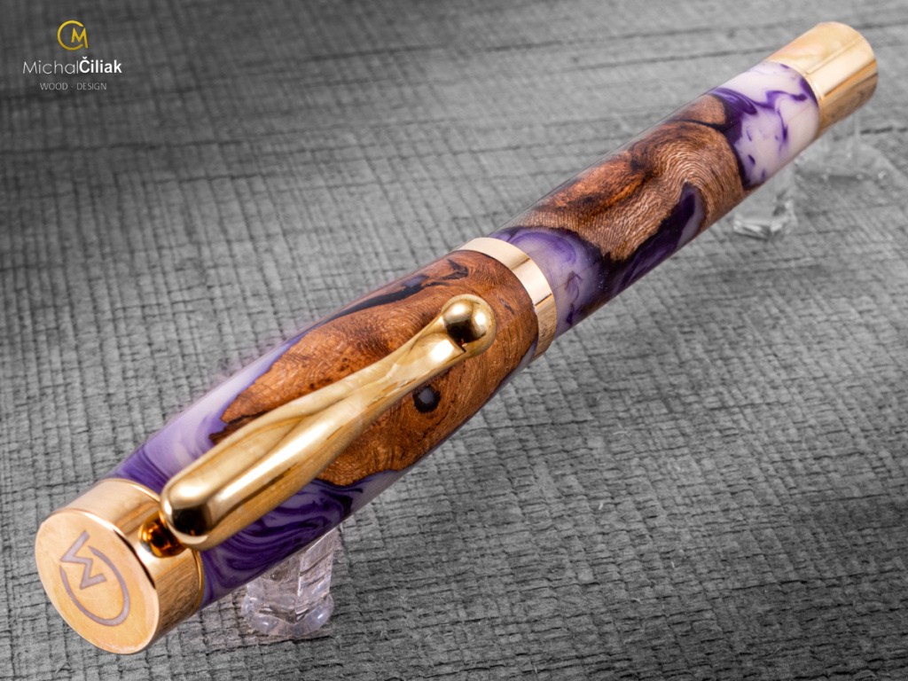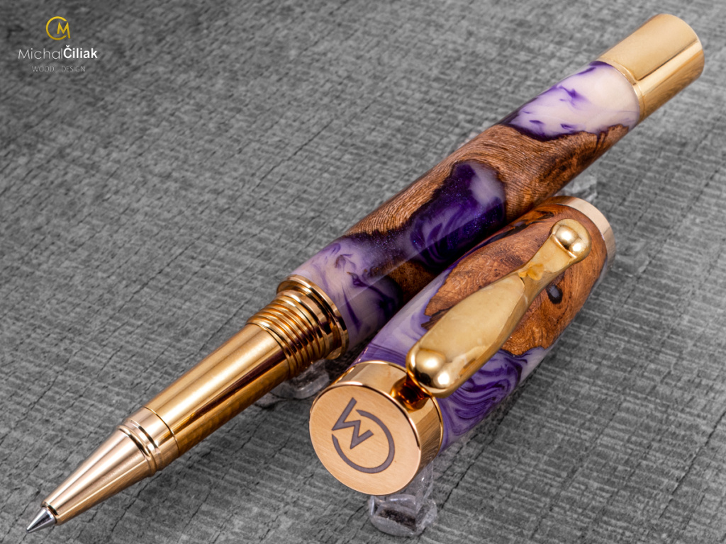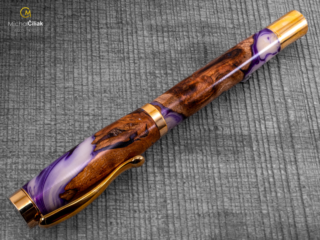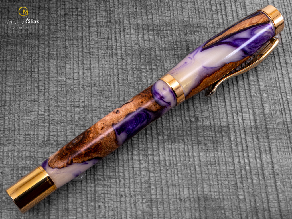 Ručně vyrobeno ze dřeva vinné révy a barvené pryskyřice. Proces výroby je poměrně složitý, je potřeba vysušených zdřevnatělých kmínků vinné révy, které se pak zalijí speciální čirou pryskyřicí dobarvenou perleťovými barvami. Po zalití je nutné z pryskyřice dostat bublinky. Nastupuje proces, kdy se pryskyřice se dřevem vloží do tlakové nádoby a pomocí tlaku 6 bar se bublinky pomalu vytlačují na povrch. Nechá se finálně zatvrdnout a pak se celý bloček, naformátuje na malé hranoly, ze kterých následně soustružím tato nádherná a zajímavá pera.