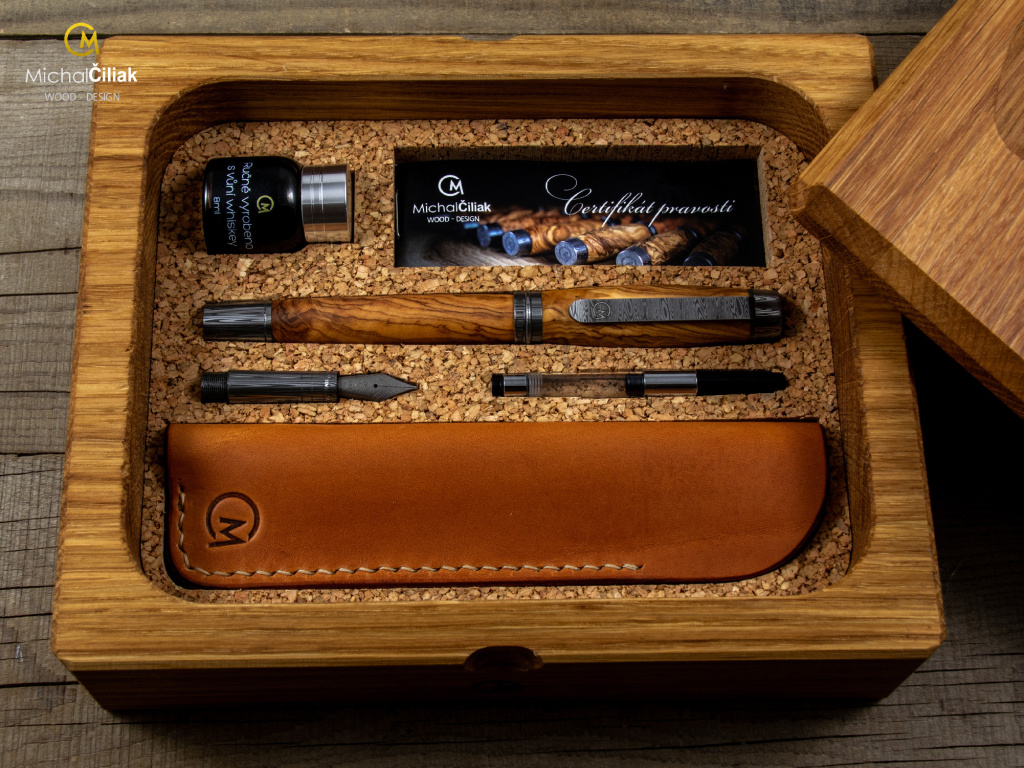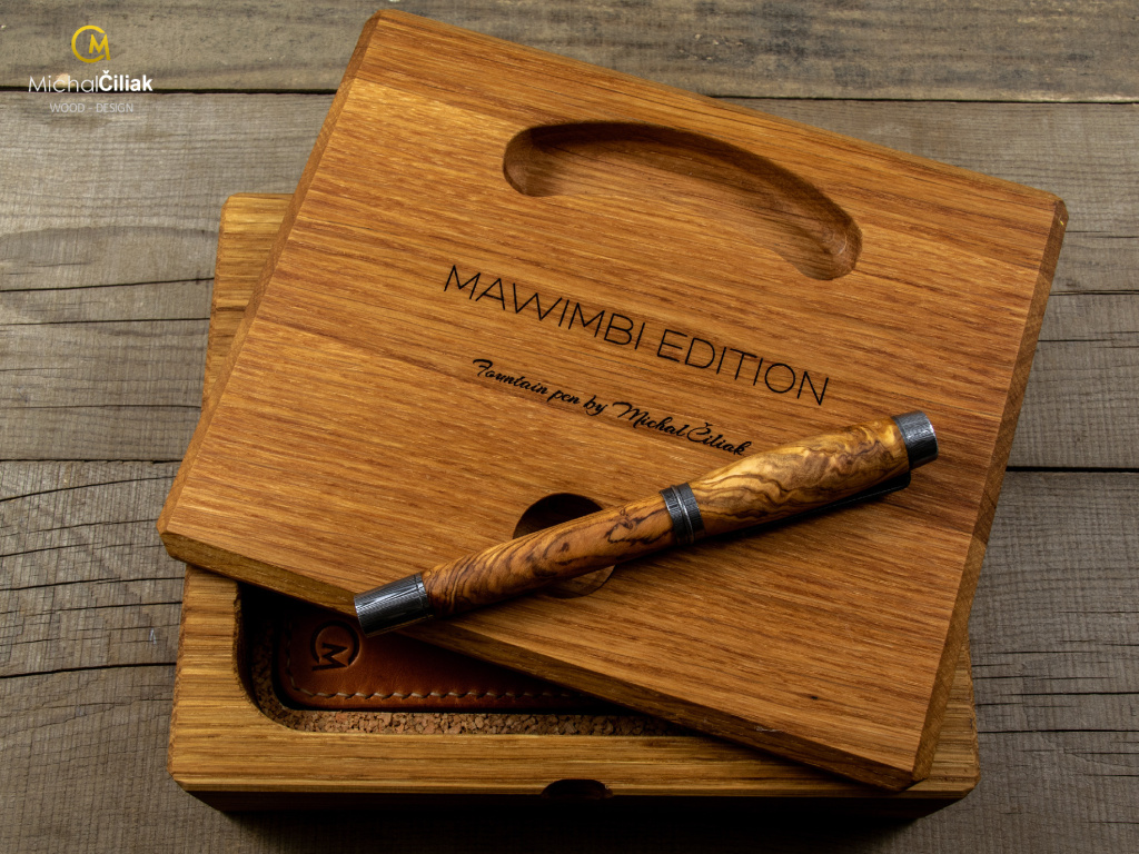 Pero je baleno jako kompletní set v ručně vyrobené, masivní dubové, krabičce, v níž pero opravdu vynikne. Navíc si můžete na vnitřní část víčka nechat vygravírovat vaše osobní přání viz. níže.