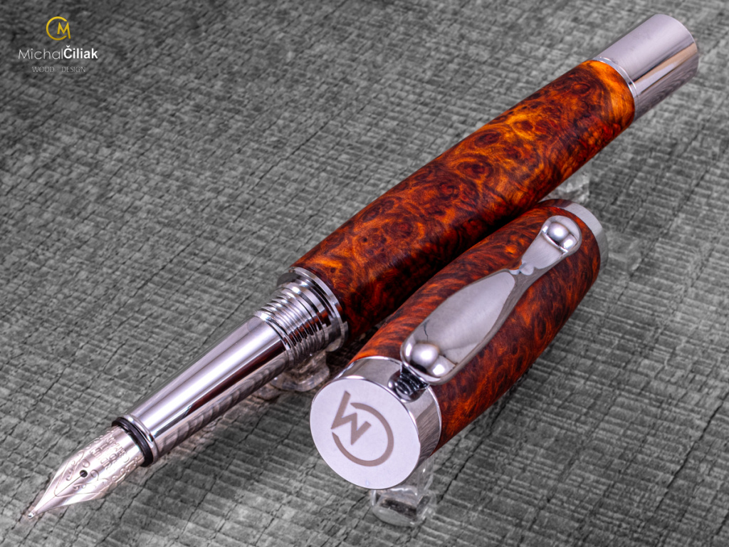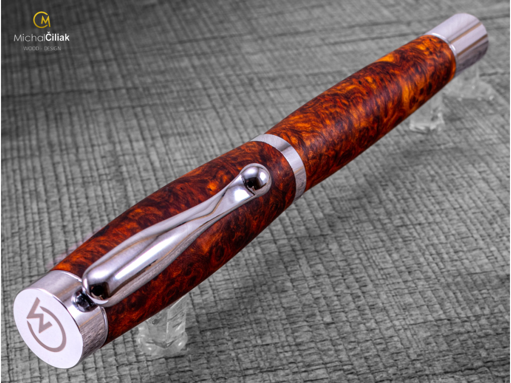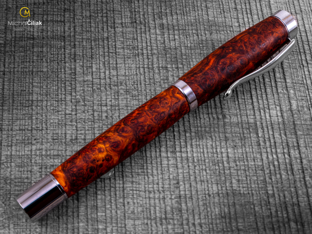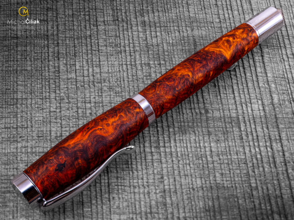 Ručně vyrobené pero z Ambonea Burl wood – luxusní dřevo s jedinečnou kresbou Toto pero je opravdu jedinečné. Ručně jsem ho vyrobil z Ambonea Burl wood, jednoho z nejvzácnějších a nejluxusnějších druhů dřeva na světě, známého svou výraznou kresbou a kontrastními odstíny od zlaté po tmavě červenou. Každý kus je originál – nikdy nenajdete dvě pera se stejnou strukturou dřeva. Ambonea wood pochází z Indonésie, nejčastěji z ostrovů Borneo, Sulawesi a Moluky. Dřevo je tvrdé, odolné a díky pomalému růstu stromů má nádhernou bohatou texturu, která na peru vytváří efektní trojrozměrný vzhled. Proces výroby je náročný – dřevo je pečlivě opracováno a spojeno do finálního tvaru. Každé pero je ručně soustruženo, leštěno a ošetřeno přírodními vosky a oleji. Výsledkem je elegantní, pevné a luxusní pero, které skvěle sedí v ruce a dlouhodobě odolává opotřebení. TIP! Pero z Ambonea Burl wood je perfektní luxusní dárek, který kombinuje jedinečný design a vzácné dřevo. Ideální pro sběratele, milovníky psacích potřeb, nebo jako originální dárek k narozeninám, výročí či významným událostem. Každý kus má svůj jedinečný příběh díky své kresbě a charakteru dřeva. S tímto perem můžete psát své vlastní příběhy nebo ho darovat někomu, kdo ocení skutečný luxus a jedinečnost.