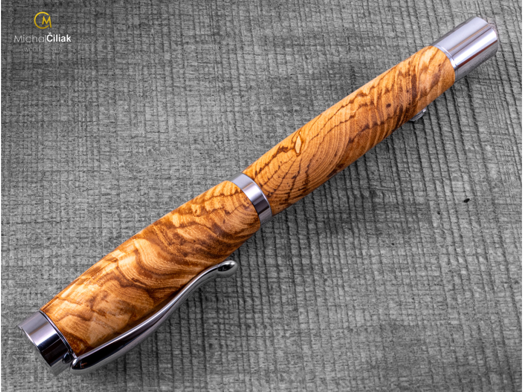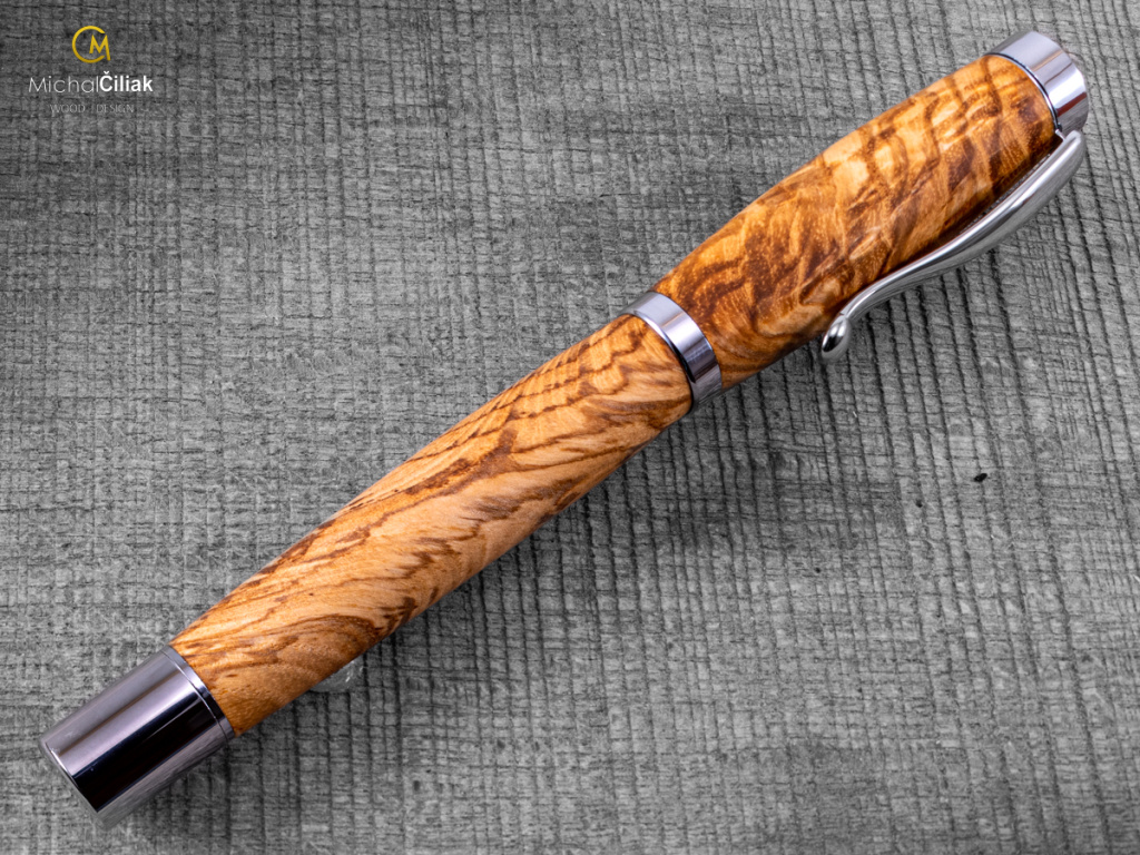 Ručně vyrobeno z českého jasanu, jehož dřevo je tvrdé a zároveň velmi pružné, patří k nejpružnějším českým dřevinám. Jádro jasanu je světle hnědé a má velmi výrazné letokruhy. Z tohoto důvodu je výběr dřeva velmi důležitý, protože některé kusy jasanového dřeva mají letokruhy hodně zajímavě tvarované a toto pero je toho důkazem. Vypadá až uměle, ale věřte, že jeho dřevo je dílem přírody.