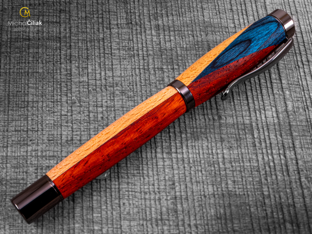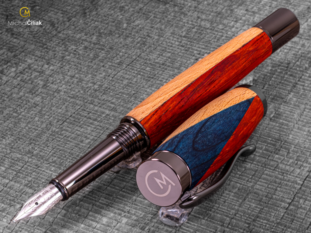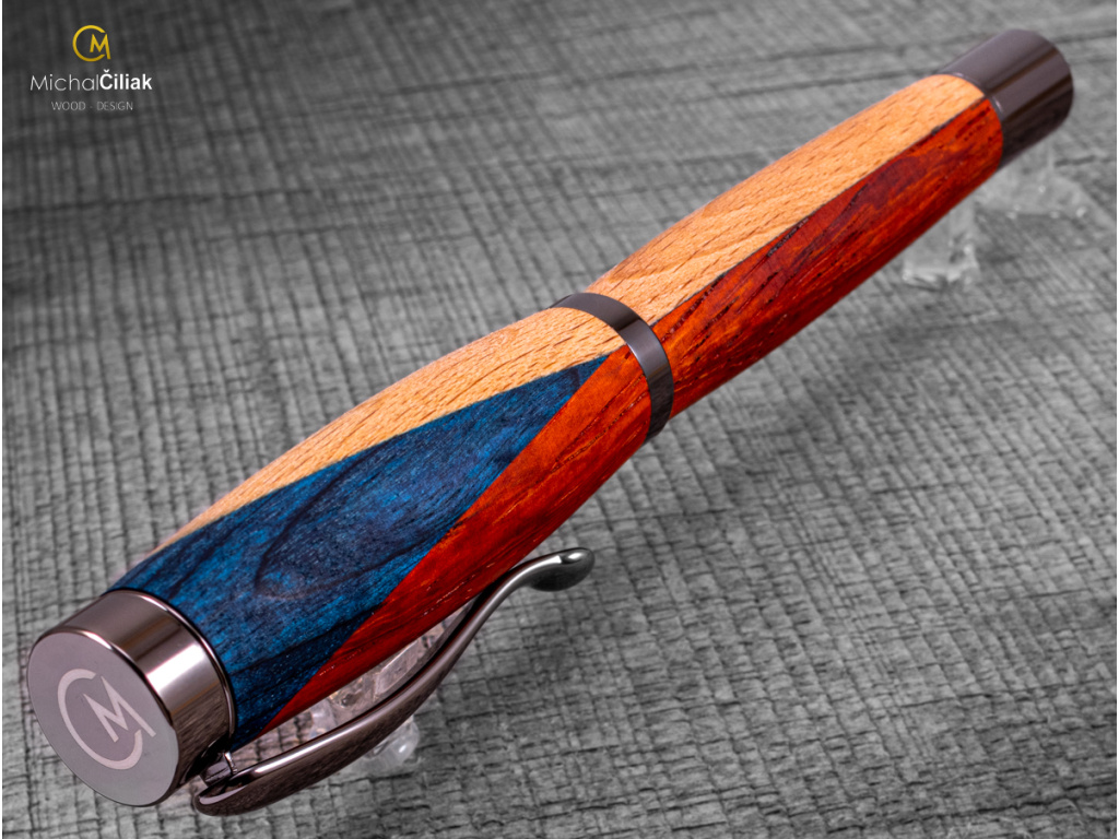 Ručně vyrobené pero v barvách české vlajky – africký padouk, buk a modrá dýha Toto luxusní dřevěné pero je originál, který propojuje českou tradici, precizní řemeslnou práci a národní symboliku. Ručně jsem ho vyrobil z trojice dřevin – bílého buku, červeného afrického padouku a modře barvené dýhy, které dohromady tvoří barvy české vlajky. Každý kus je jedinečný a nese vlastní příběh. Bílá část pera je z českého buku – jemné, pevné a ikonické dřevo s krásnou přirozenou kresbou. Červený africký padouk dodává peru výrazný teplý tón, pevnost a luxusní vzhled. Modrá část je tvořena speciálně barvenou dýhou, která zachovává přirozenou strukturu dřeva a dodává sytý modrý odstín. Proces výroby je náročný a každý krok je proveden ručně. Dřevo je pečlivě vybíráno, vysušeno, přesně spojeno a soustruženo do finálního tvaru, který evokuje českou vlajku. Finální povrch pera je ručně leštěný a ošetřený přírodními vosky a oleji, takže pero nejen krásně vypadá, ale je také příjemné v ruce a dlouhodobě odolné. TIP! Toto pero je ideální jako luxusní dárek pro každého, kdo miluje českou tradici, design a originální řemeslo. Skvělé k narozeninám, výročí, maturitě nebo jako jedinečný firemní dárek. Podívejte se, jak vzniká – každý kus je originál s vlastním příběhem. Pište s ním své vlastní příběhy nebo darujte jako opravdu jedinečný dárek.