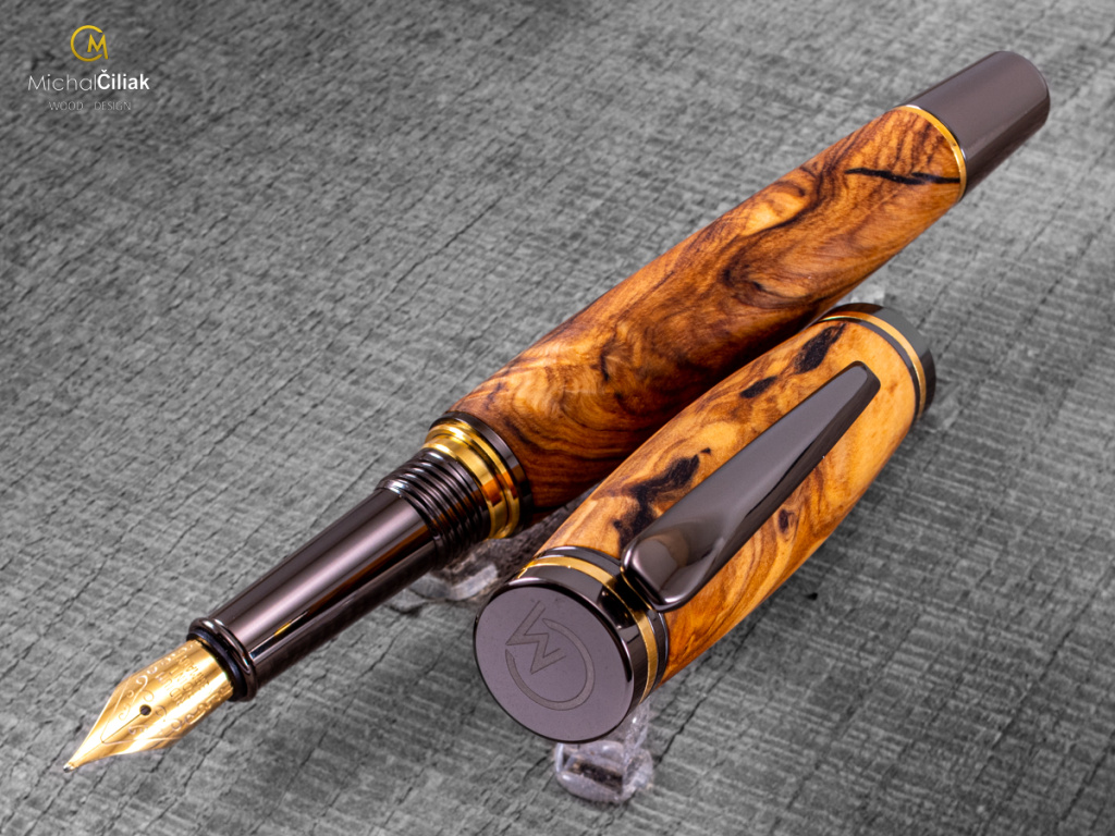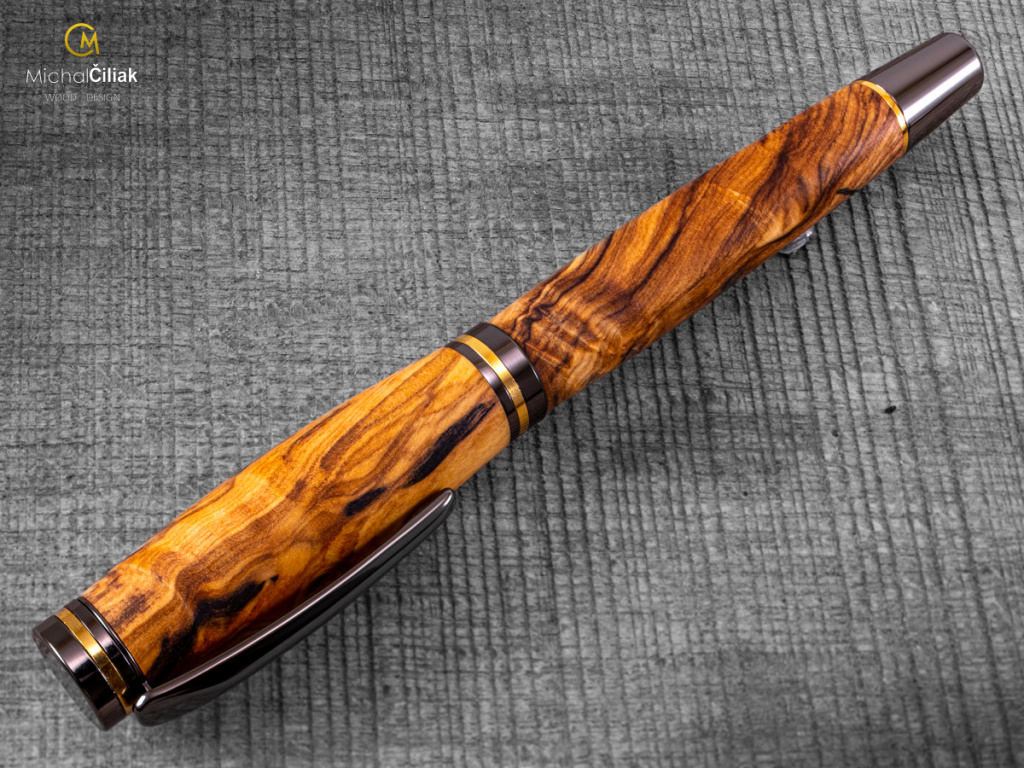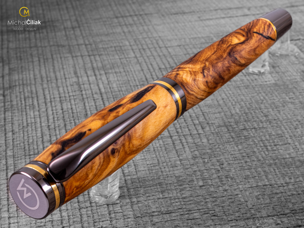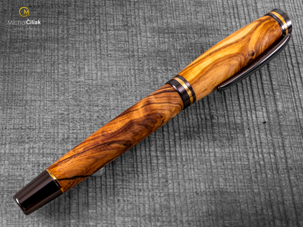 Ručně vyrobeno z barvené pryskyřice a prvotřídního olivového dřeva, které je pevné, velice odolné a má velmi zajímavé zbarvení od krémové přes růžovou až po černou. Osobně jsem ho dovezl z řeckého ostrova Karpathos, kde jsem jeho sháněním strávil téměř měsíc a půl. Nejdéle mi trvalo sehnat kontakt na místního farmáře, který mi prodal velké špalky olivového dřeva, jehož stáří odhadl na cca 700 let. Pomalý růst stromů způsobuje, že je dřevo velmi tvrdé, kmeny jsou rostlé velmi rozmanitě a díky tomu má olivovník úchvatnou kresbu. Proces spojení dřeva a pryskyřice je poměrně složitý, je potřeba vysušených popraskaných nebo jinak děravých kousků olivového dřeva, které se pak zalije speciální čirou pryskyřicí dobarvenou barvami. Po zalití je nutné z pryskyřice a dřeva dostat bublinky. Nastupuje proces, kdy se pryskyřice se dřevem vloží do tlakové nádoby a pomocí tlaku 6 bar se bublinky pomalu vytlačují na povrch. Nechá se finálně zatvrdnout a pak se celý bloček, naformátuje na malé hranoly, ze kterých následně soustružím tato nádherná a zajímavá pera. TIP! Pero s příběhem o tom, jak se v kopcích ostrova Karpathos našlo stovky let staré olivové dřevo, ze kterého jsem společně s místním truhlářem vyřezal výběrové kusy, převezl je do své dílny a vdechnul jim nový život. Podívejte se zde, jak tohle skvostné pero vznikalo. Budete s ním psát vaše vlastní příběhy, nebo ho někomu věnujete jako opravdu originální dárek?