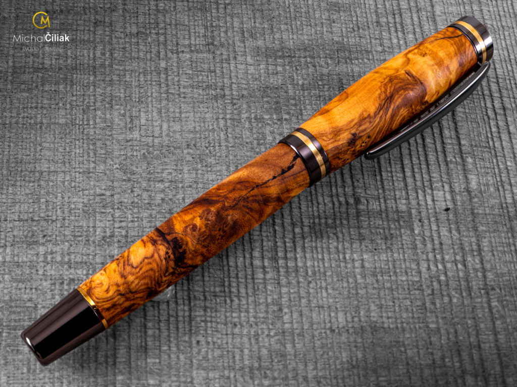 Ručně vyrobeno z barvené pryskyřice a prvotřídního olivového dřeva, které je pevné, velice odolné a má velmi zajímavé zbarvení od krémové přes růžovou až po černou. Osobně jsem ho dovezl z řeckého ostrova Karpathos, kde jsem jeho sháněním strávil téměř měsíc a půl. Nejdéle mi trvalo sehnat kontakt na místního farmáře, který mi prodal velké špalky olivového dřeva, jehož stáří odhadl na cca 700 let. Pomalý růst stromů způsobuje, že je dřevo velmi tvrdé, kmeny jsou rostlé velmi rozmanitě a díky tomu má olivovník úchvatnou kresbu. Proces spojení dřeva a pryskyřice je poměrně složitý, je potřeba vysušených popraskaných nebo jinak děravých kousků olivového dřeva, které se pak zalije speciální čirou pryskyřicí dobarvenou barvami. Po zalití je nutné z pryskyřice a dřeva dostat bublinky. Nastupuje proces, kdy se pryskyřice se dřevem vloží do tlakové nádoby a pomocí tlaku 6 bar se bublinky pomalu vytlačují na povrch. Nechá se finálně zatvrdnout a pak se celý bloček, naformátuje na malé hranoly, ze kterých následně soustružím tato nádherná a zajímavá pera. TIP! Pero s příběhem o tom, jak se v kopcích ostrova Karpathos našlo stovky let staré olivové dřevo, ze kterého jsem společně s místním truhlářem vyřezal výběrové kusy, převezl je do své dílny a vdechnul jim nový život. Podívejte se zde, jak tohle skvostné pero vznikalo. Budete s ním psát vaše vlastní příběhy, nebo ho někomu věnujete jako opravdu originální dárek?
