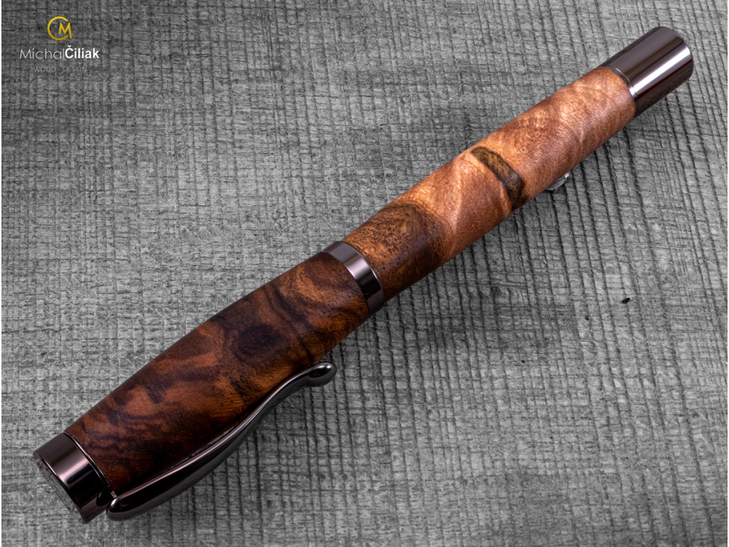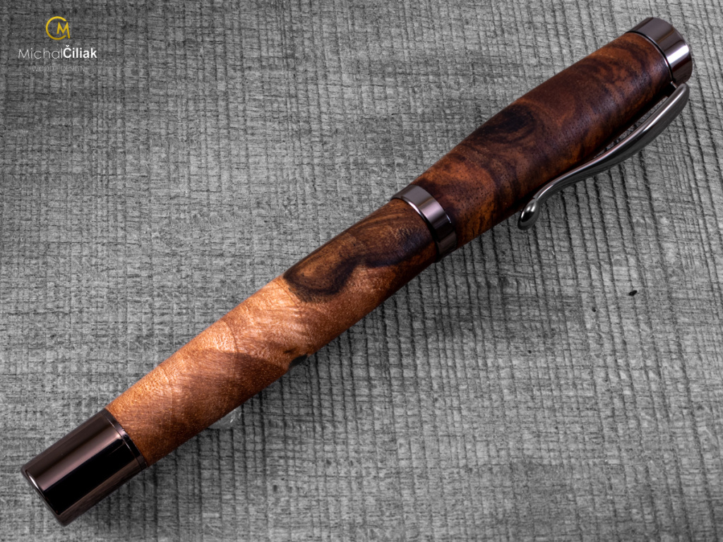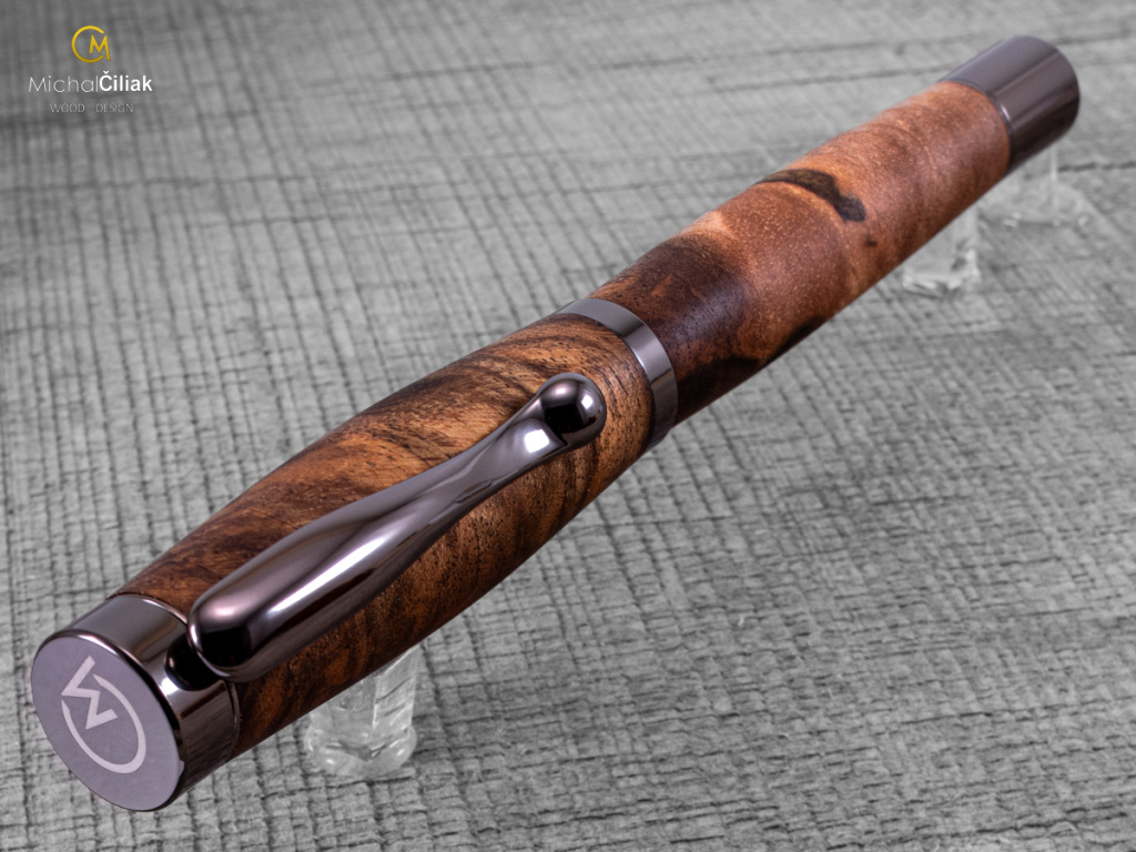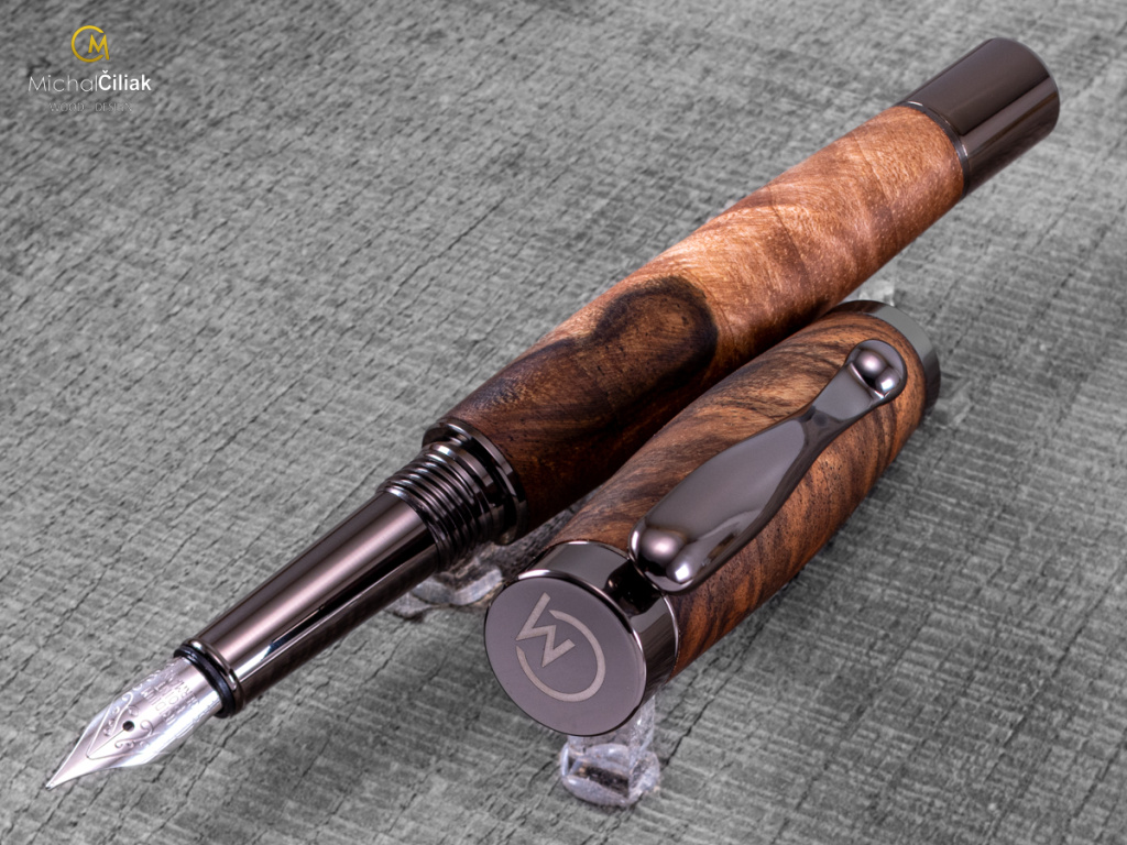 Ručně vyrobeno z českého ořechového dřeva, které vyniká svou elegancí a je vysoce ceněné. Pero je vyrobeno z jádrové části dřeva, která má tmavě hnědou až černou barvu s nezaměnitelnou texturou.