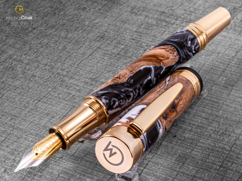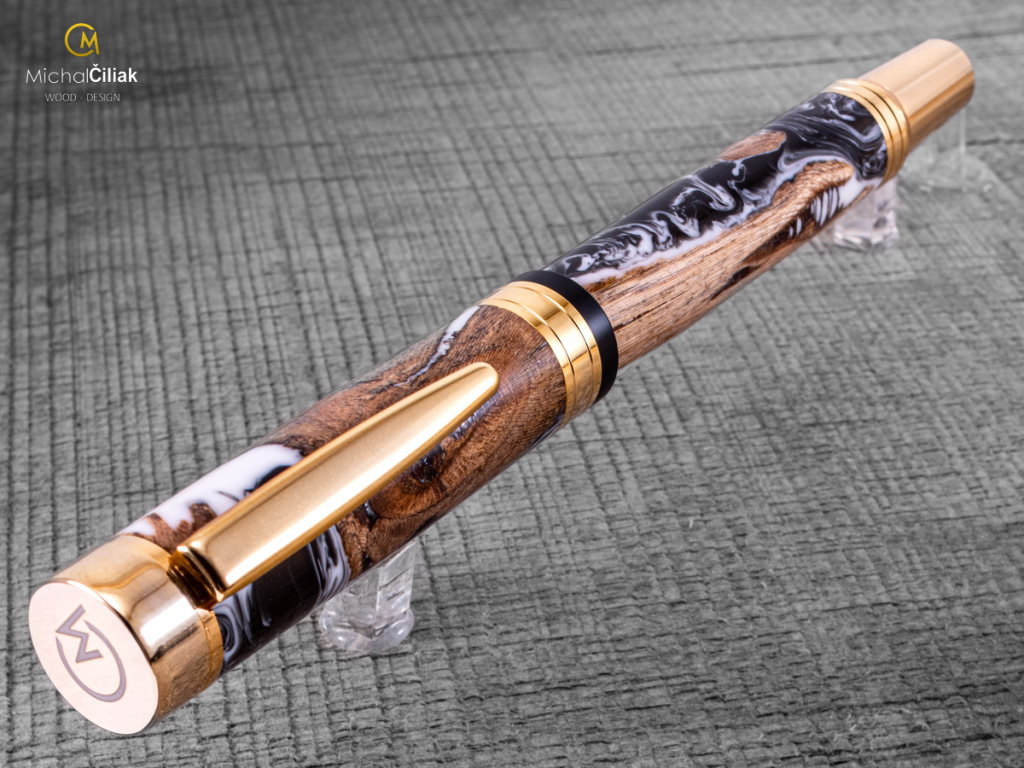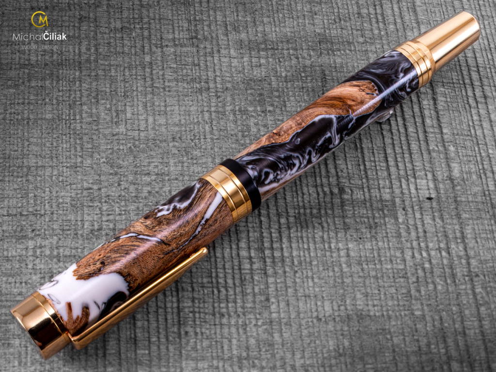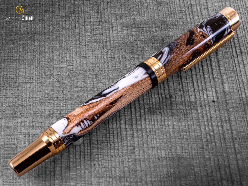 Ručně vyrobeno ze dřeva vinné révy a barvené pryskyřice. Proces výroby je poměrně složitý, je potřeba vysušených zdřevnatělých kmínků vinné révy, které se pak zalijí speciální čirou pryskyřicí dobarvenou perleťovými barvami. Po zalití je nutné z pryskyřice dostat bublinky. Nastupuje proces, kdy se pryskyřice se dřevem vloží do tlakové nádoby a pomocí tlaku 6 bar se bublinky pomalu vytlačují na povrch. Nechá se finálně zatvrdnout a pak se celý bloček, naformátuje na malé hranoly, ze kterých následně soustružím tato nádherná a zajímavá pera.