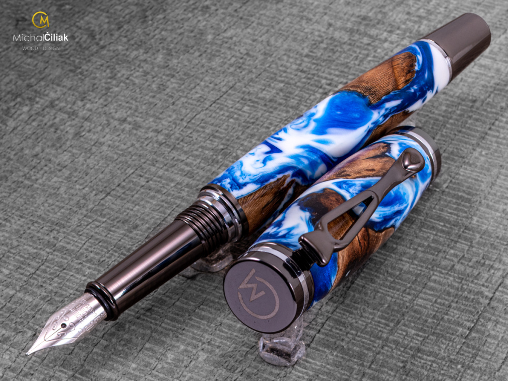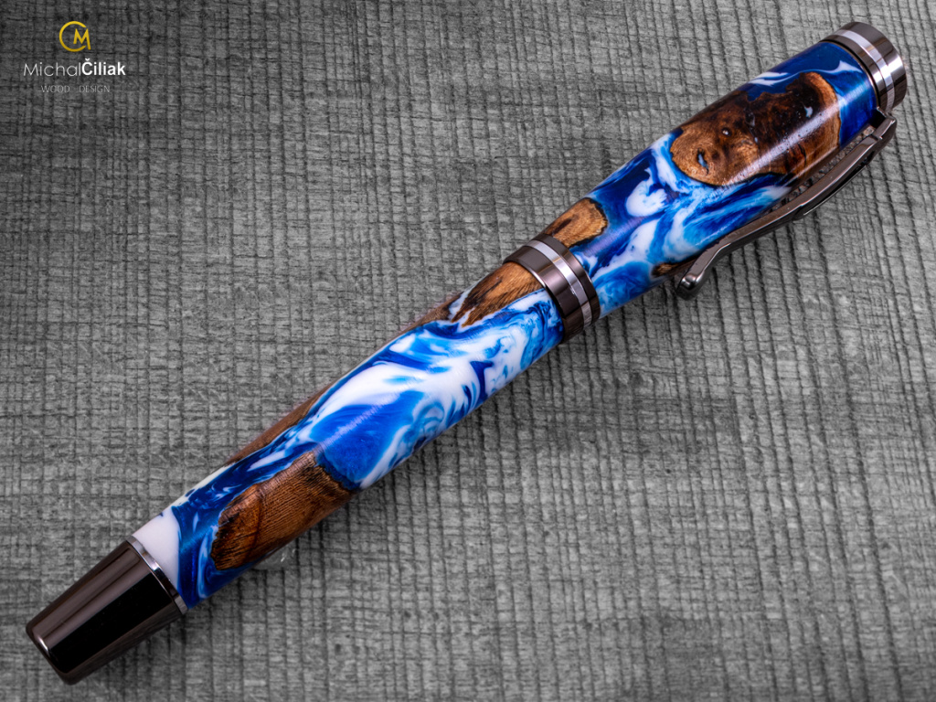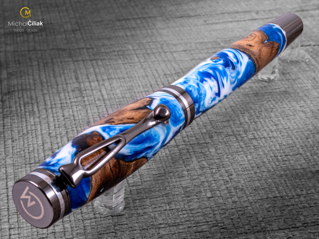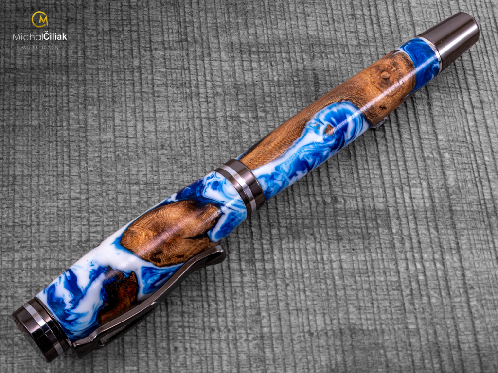 Ručně vyrobeno ze dřeva vinné révy a barvené pryskyřice. Proces výroby je poměrně složitý, je potřeba vysušených zdřevnatělých kmínků vinné révy, které se pak zalijí speciální čirou pryskyřicí dobarvenou perleťovými barvami. Po zalití je nutné z pryskyřice dostat bublinky. Nastupuje proces, kdy se pryskyřice se dřevem vloží do tlakové nádoby a pomocí tlaku 6 bar se bublinky pomalu vytlačují na povrch. Nechá se finálně zatvrdnout a pak se celý bloček, naformátuje na malé hranoly, ze kterých následně soustružím tato nádherná a zajímavá pera.