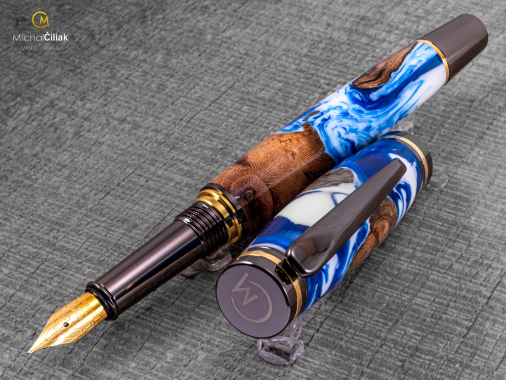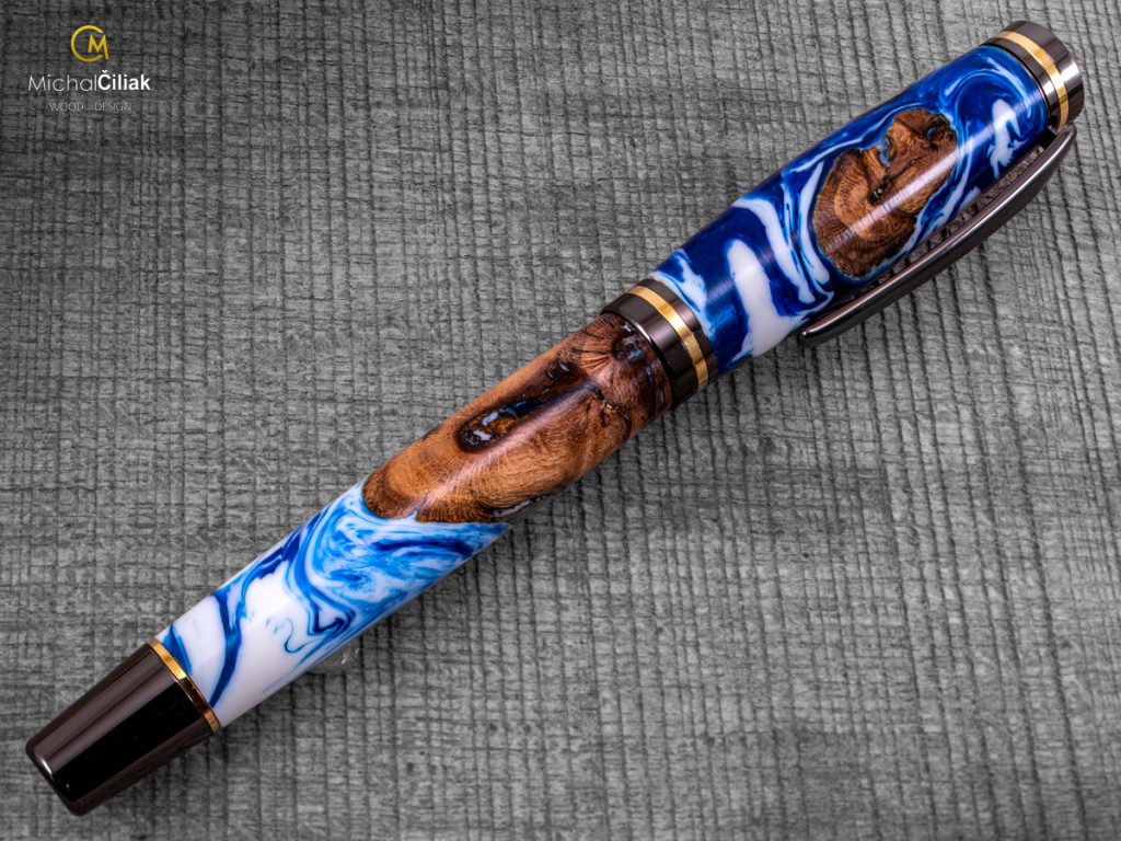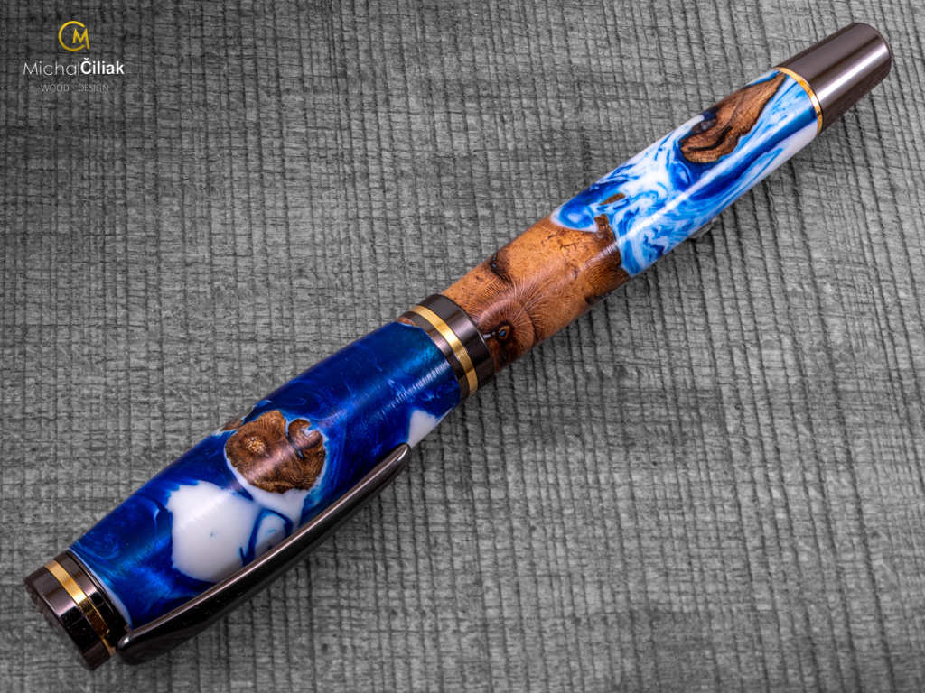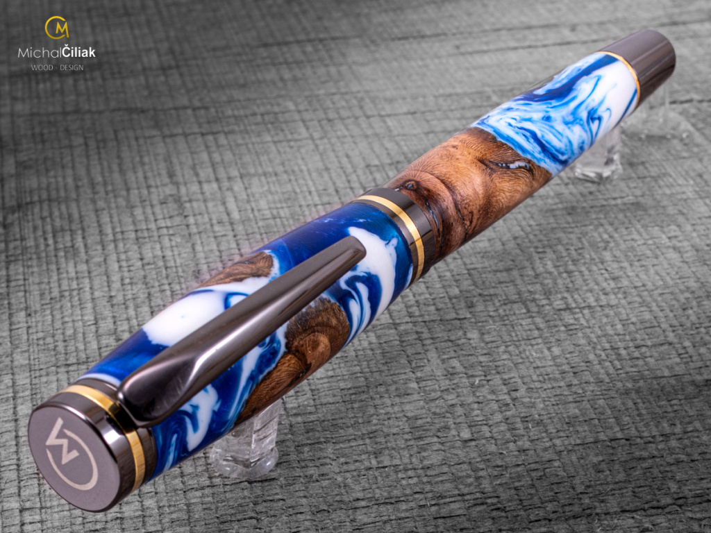 Ručně vyrobeno ze dřeva vinné révy a barvené pryskyřice. Proces výroby je poměrně složitý, je potřeba vysušených zdřevnatělých kmínků vinné révy, které se pak zalijí speciální čirou pryskyřicí dobarvenou perleťovými barvami. Po zalití je nutné z pryskyřice dostat bublinky. Nastupuje proces, kdy se pryskyřice se dřevem vloží do tlakové nádoby a pomocí tlaku 6 bar se bublinky pomalu vytlačují na povrch. Nechá se finálně zatvrdnout a pak se celý bloček, naformátuje na malé hranoly, ze kterých následně soustružím tato nádherná a zajímavá pera.