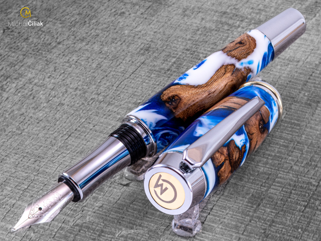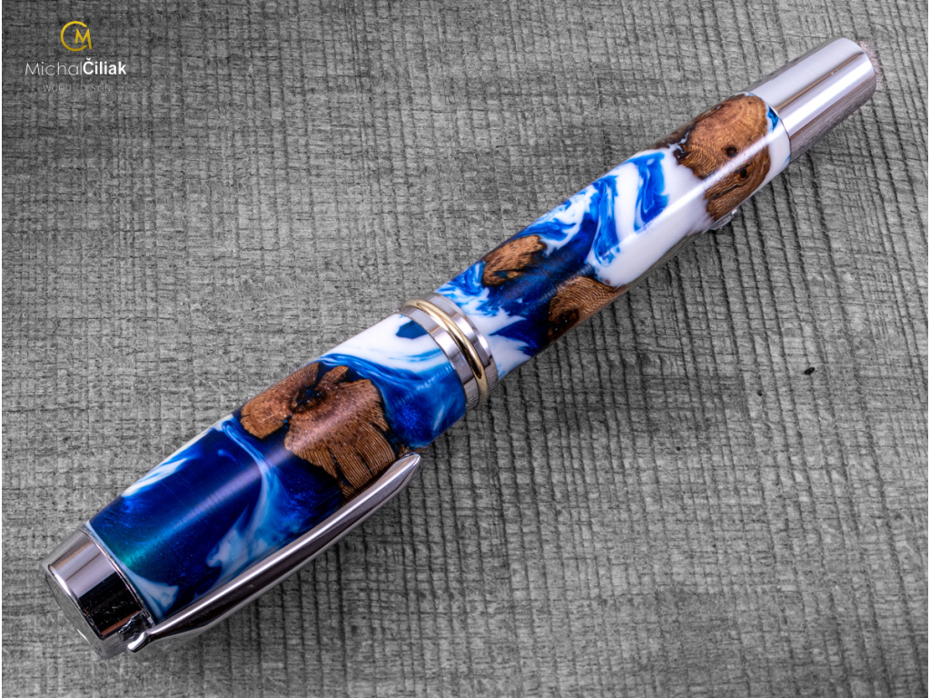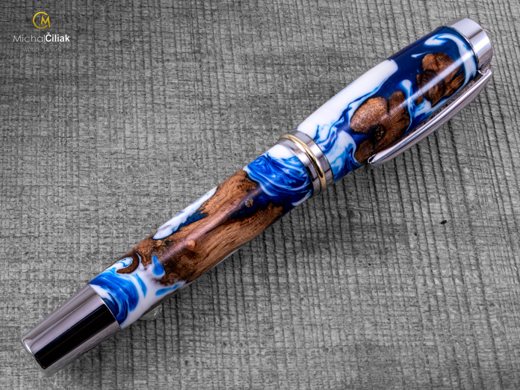 Ručně vyrobeno ze dřeva vinné révy a barvené pryskyřice. Proces výroby je poměrně složitý, je potřeba vysušených zdřevnatělých kmínků vinné révy, které se pak zalijí speciální čirou pryskyřicí dobarvenou perleťovými barvami. Po zalití je nutné z pryskyřice dostat bublinky. Nastupuje proces, kdy se pryskyřice se dřevem vloží do tlakové nádoby a pomocí tlaku 6 bar se bublinky pomalu vytlačují na povrch. Nechá se finálně zatvrdnout a pak se celý bloček, naformátuje na malé hranoly, ze kterých následně soustružím tato nádherná a zajímavá pera.