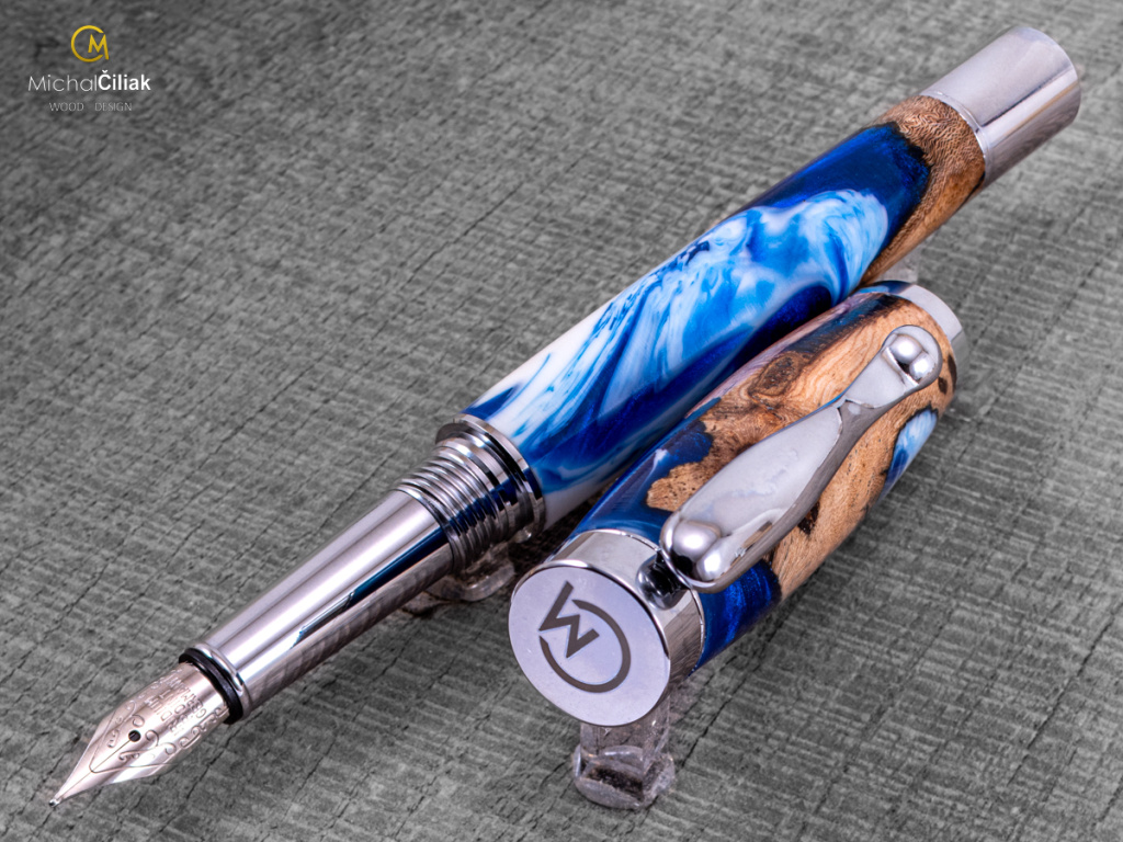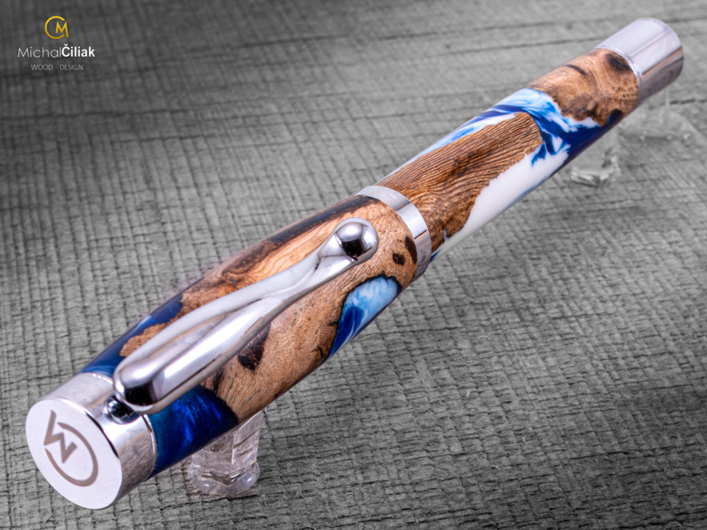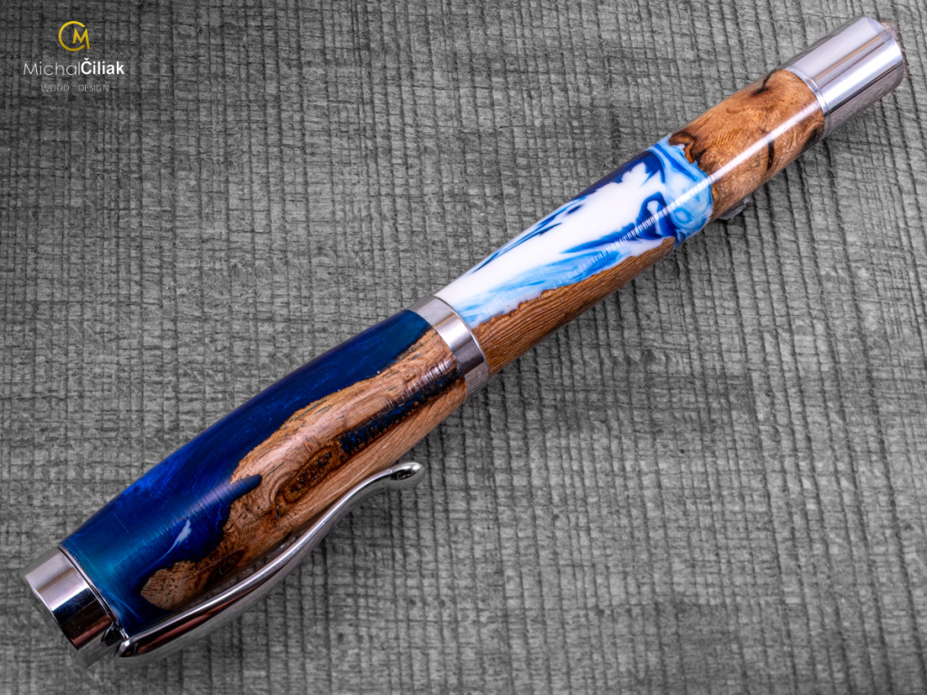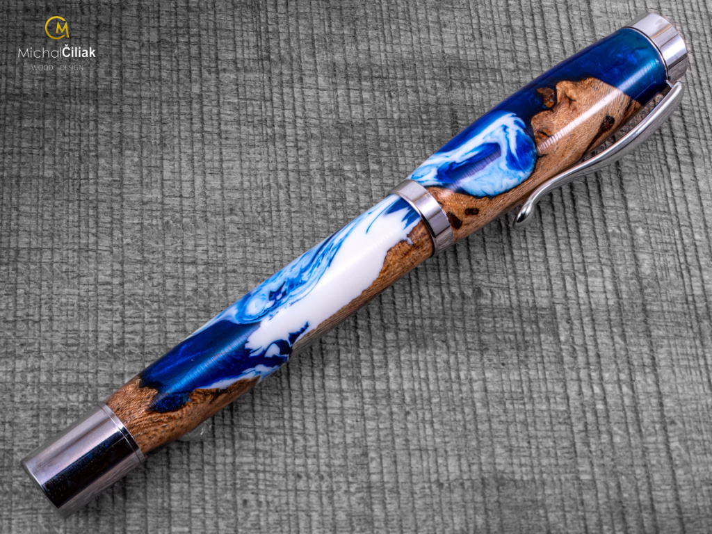 Ručně vyrobeno ze dřeva vinné révy a barvené pryskyřice. Proces výroby je poměrně složitý, je potřeba vysušených zdřevnatělých kmínků vinné révy, které se pak zalijí speciální čirou pryskyřicí dobarvenou perleťovými barvami. Po zalití je nutné z pryskyřice dostat bublinky. Nastupuje proces, kdy se pryskyřice se dřevem vloží do tlakové nádoby a pomocí tlaku 6 bar se bublinky pomalu vytlačují na povrch. Nechá se finálně zatvrdnout a pak se celý bloček, naformátuje na malé hranoly, ze kterých následně soustružím tato nádherná a zajímavá pera.