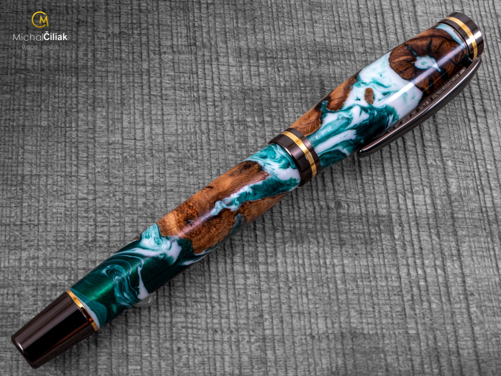 Ručně vyrobeno ze dřeva vinné révy a barvené pryskyřice. Proces výroby je poměrně složitý, je potřeba vysušených zdřevnatělých kmínků vinné révy, které se pak zalijí speciální čirou pryskyřicí dobarvenou perleťovými barvami. Po zalití je nutné z pryskyřice dostat bublinky. Nastupuje proces, kdy se pryskyřice se dřevem vloží do tlakové nádoby a pomocí tlaku 6 bar se bublinky pomalu vytlačují na povrch. Nechá se finálně zatvrdnout a pak se celý bloček, naformátuje na malé hranoly, ze kterých následně soustružím tato nádherná a zajímavá pera.