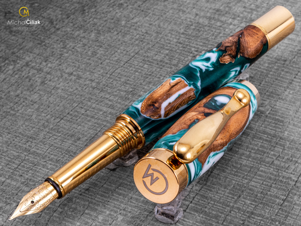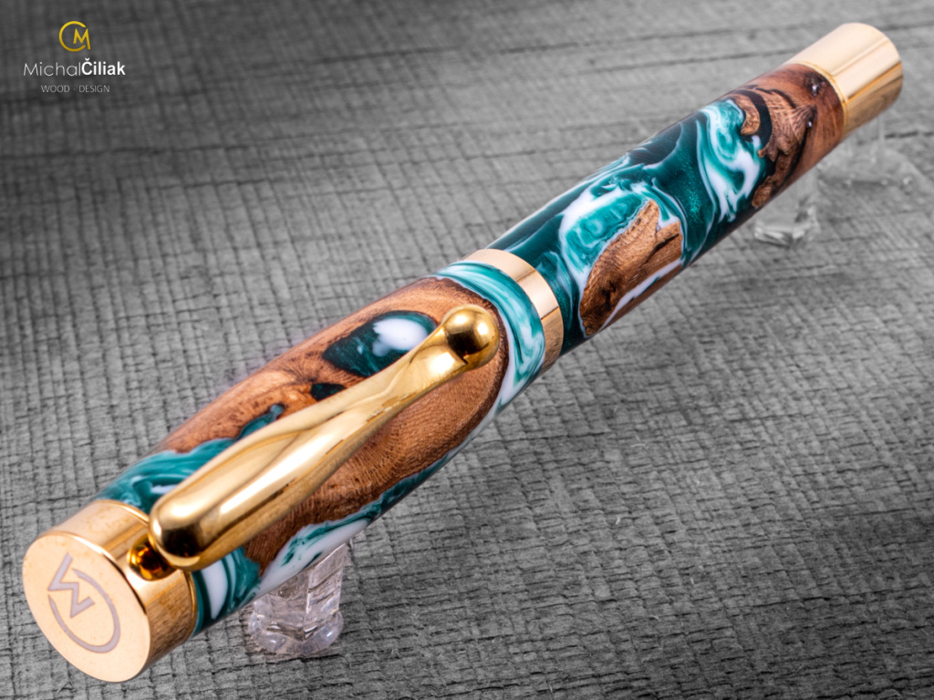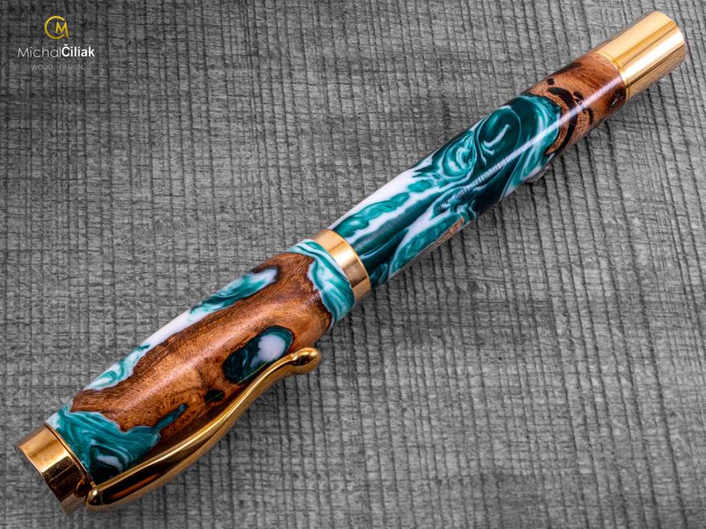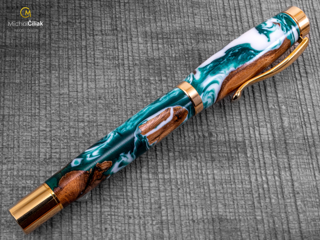 Ručně vyrobeno ze dřeva vinné révy a barvené pryskyřice. Proces výroby je poměrně složitý, je potřeba vysušených zdřevnatělých kmínků vinné révy, které se pak zalijí speciální čirou pryskyřicí dobarvenou perleťovými barvami. Po zalití je nutné z pryskyřice dostat bublinky. Nastupuje proces, kdy se pryskyřice se dřevem vloží do tlakové nádoby a pomocí tlaku 6 bar se bublinky pomalu vytlačují na povrch. Nechá se finálně zatvrdnout a pak se celý bloček, naformátuje na malé hranoly, ze kterých následně soustružím tato nádherná a zajímavá pera.