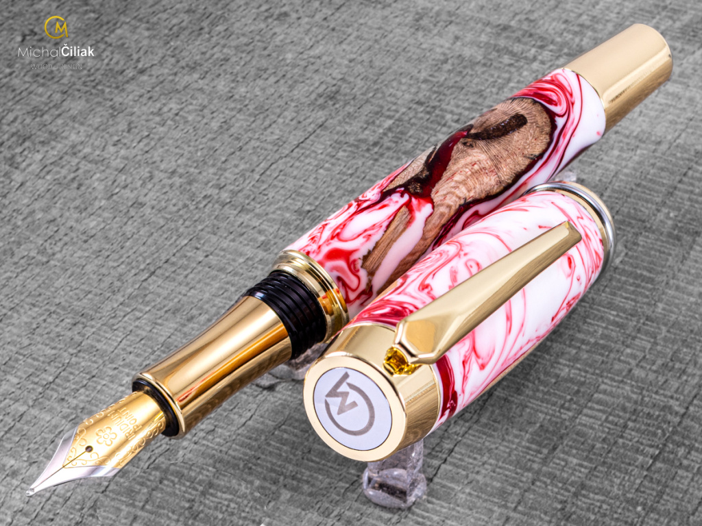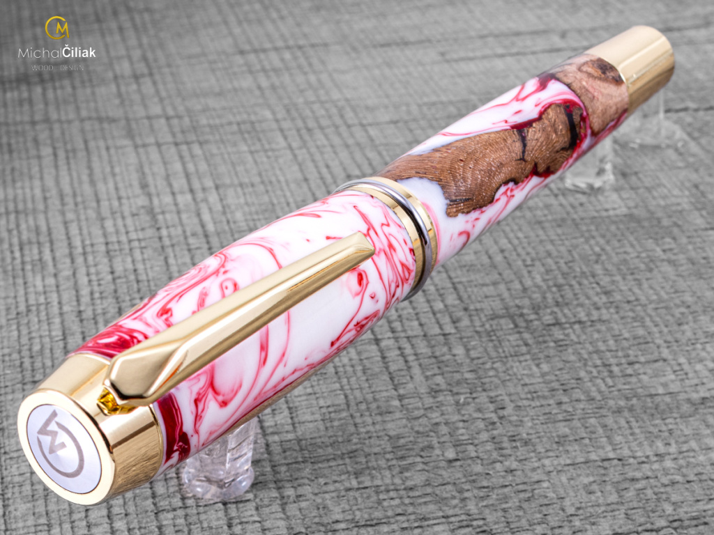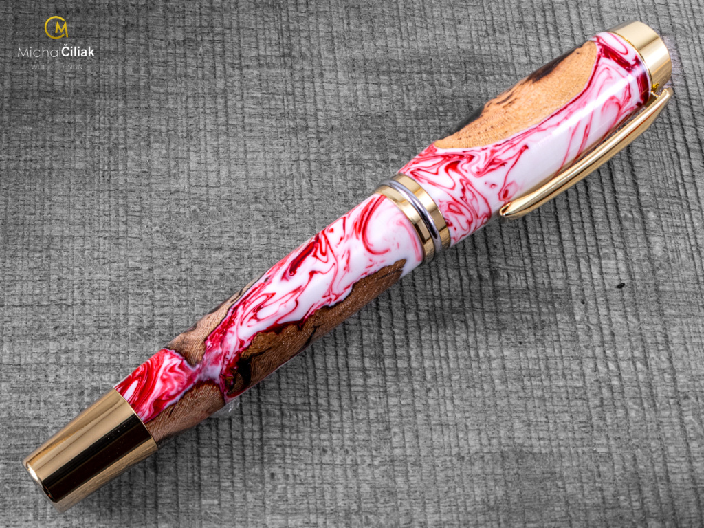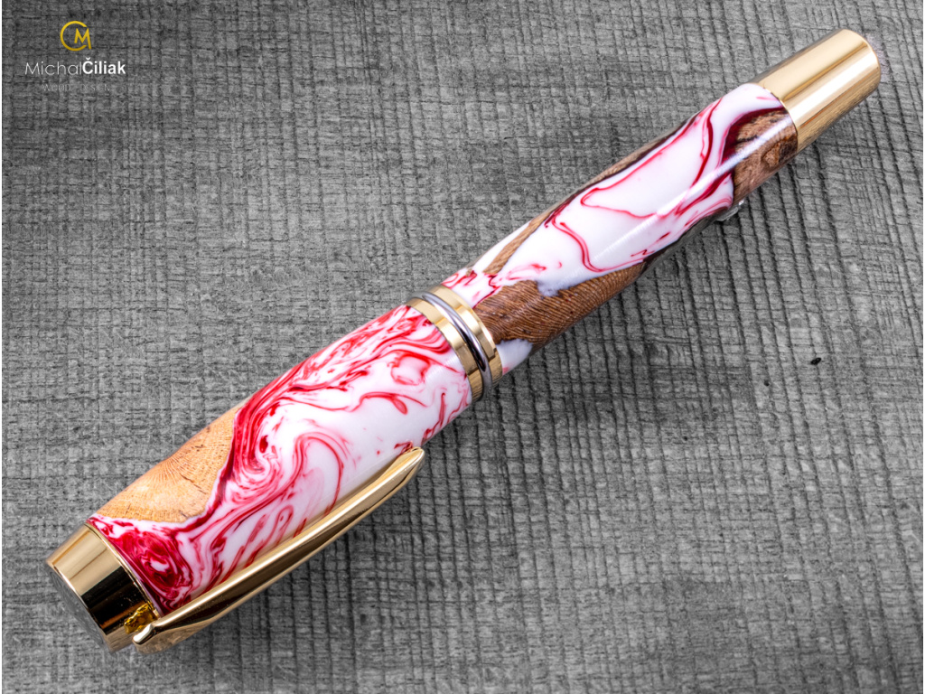 Ručně vyrobeno ze dřeva vinné révy a barvené pryskyřice. Proces výroby je poměrně složitý, je potřeba vysušených zdřevnatělých kmínků vinné révy, které se pak zalijí speciální čirou pryskyřicí dobarvenou perleťovými barvami. Po zalití je nutné z pryskyřice dostat bublinky. Nastupuje proces, kdy se pryskyřice se dřevem vloží do tlakové nádoby a pomocí tlaku 6 bar se bublinky pomalu vytlačují na povrch. Nechá se finálně zatvrdnout a pak se celý bloček, naformátuje na malé hranoly, ze kterých následně soustružím tato nádherná a zajímavá pera.