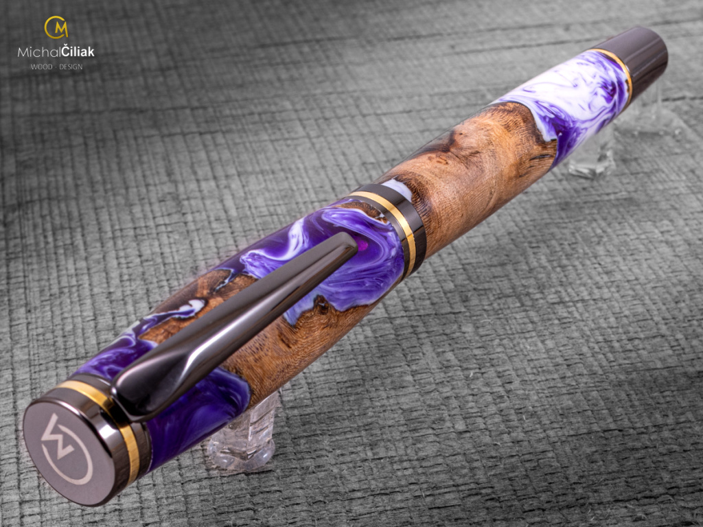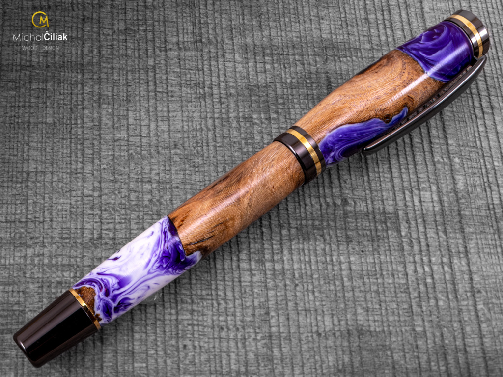 Ručně vyrobeno ze dřeva vinné révy a barvené pryskyřice. Proces výroby je poměrně složitý, je potřeba vysušených zdřevnatělých kmínků vinné révy, které se pak zalijí speciální čirou pryskyřicí dobarvenou perleťovými barvami. Po zalití je nutné z pryskyřice dostat bublinky. Nastupuje proces, kdy se pryskyřice se dřevem vloží do tlakové nádoby a pomocí tlaku 6 bar se bublinky pomalu vytlačují na povrch. Nechá se finálně zatvrdnout a pak se celý bloček, naformátuje na malé hranoly, ze kterých následně soustružím tato nádherná a zajímavá pera.